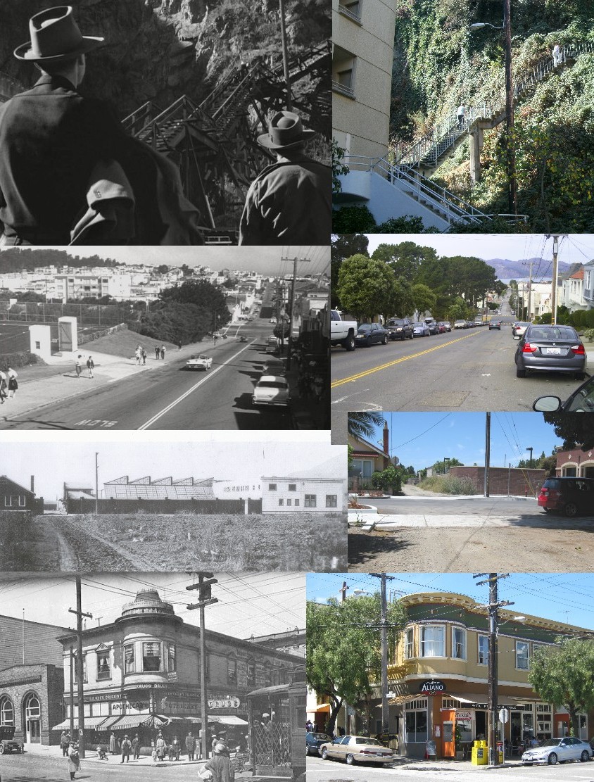 “Telephone poles! So, these are of enormous interest to us, Tim, because?” Well, telephone poles can be interesting, there’s one in Niles that dates back to 1860 when it was a telegraph pole! At top left, a bandaged and, obviously, hurt Humphrey Bogart is being heckled by strangers as he begins his climb up the old wooden Filbert Steps in the 1947 film ‘Dark Passage’. “Hey, Bud, had a rough night?” “Having trouble with the little lady?” Oh, these guys are a riot! A lot of people get killed by Bogie in this movie, but these two got off easy! The wooden portion of the Filbert Steps have been replaced here in the current picture on the right, and I know as much about telephone poles as I do about girls, but by the way this pole leans, I’m going to give the nod to this being the same one. Second from the top, the telephone poles in the film picture on the left and the some location today were just an excuse to post this image from the 1962 film ‘Experiment in Terror’. My Physician, Dr. Knotts in Castro Valley, told me that he was one of the students walking up the hill at George Washington High School when this scene with Lee Remick and Stefanie Powers driving up the street to the school was filmed. I’m not going to argue with him, he’s the one who has to tell me all of the things that are wrong with me! Second from the bottom: Speaking of Niles, the old horse trail still passes between the house that was once Bronco Billy’s office, the first film cowboy superstar, and a telephone pole. To the right of the house is the old Essanay Studios, circa 1915. A fire station now occupies the spot where the studio was. Many people don’t realize it, but at that fire station is where the world first met Charlie Chaplin’s little tramp! At the bottom, Erich Von Stroheim’s ‘Greed’ is considered one of the best silent films ever made. This 1925 tale of murder and pursuit originally ran nearly eight hours, but was eventually cut down to under two and one half hours running time when released. Probably, just as well; that would have been a lot of popcorn to have to consume. The old office building on the corner of Laguna Ave. & Hayes seen in a film image on the left is where the movie’s main protagonist, McTeague, sets up his dental practice before he eventually kills his miserly wife, and flees to Death Valley while being pursued by her lover. The two telephone poles look to be still there today, although, another one has been placed in the middle. (Thumbnail image)