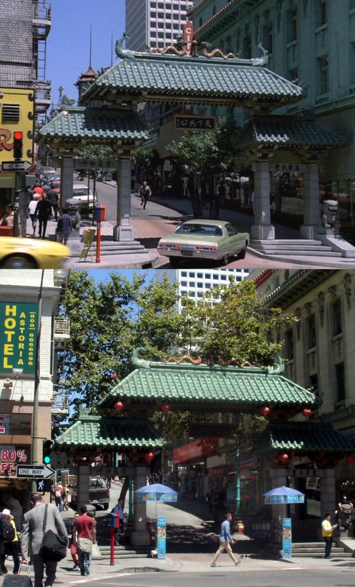 Bad guy Vic Morrow being chased toward the Chinatown gate by Michael Douglas, loses his balance after hitting a Chronicle paper box, and falls into oncoming traffic. (Thumbnail image)