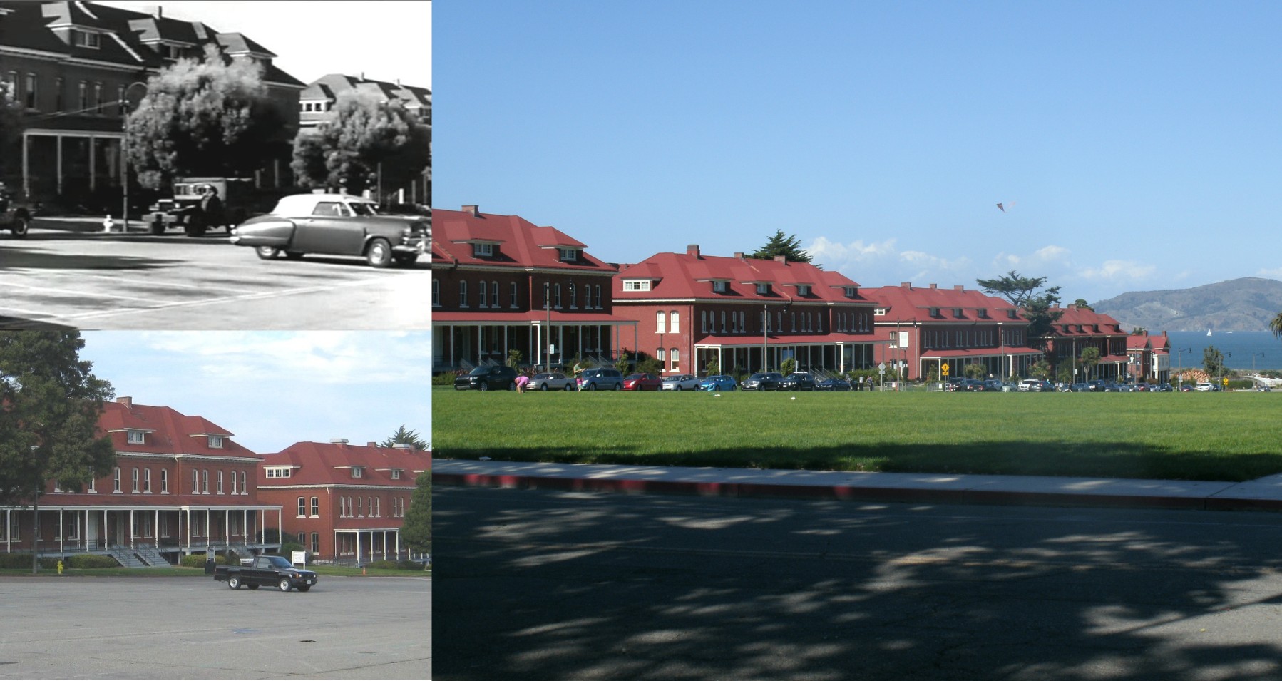 The inmates are transported to the old Montgomery Barracks in the Presidio at the upper left. Just a few years ago when I did the comparison at the lower left, the area was, relatively, quiet. Now thanks to the popularity of the Walt Disney Museum in the barracks, there’s a new lawn, pay parking, (Oh, well!) and a great museum to enjoy. (Thumbnail image)