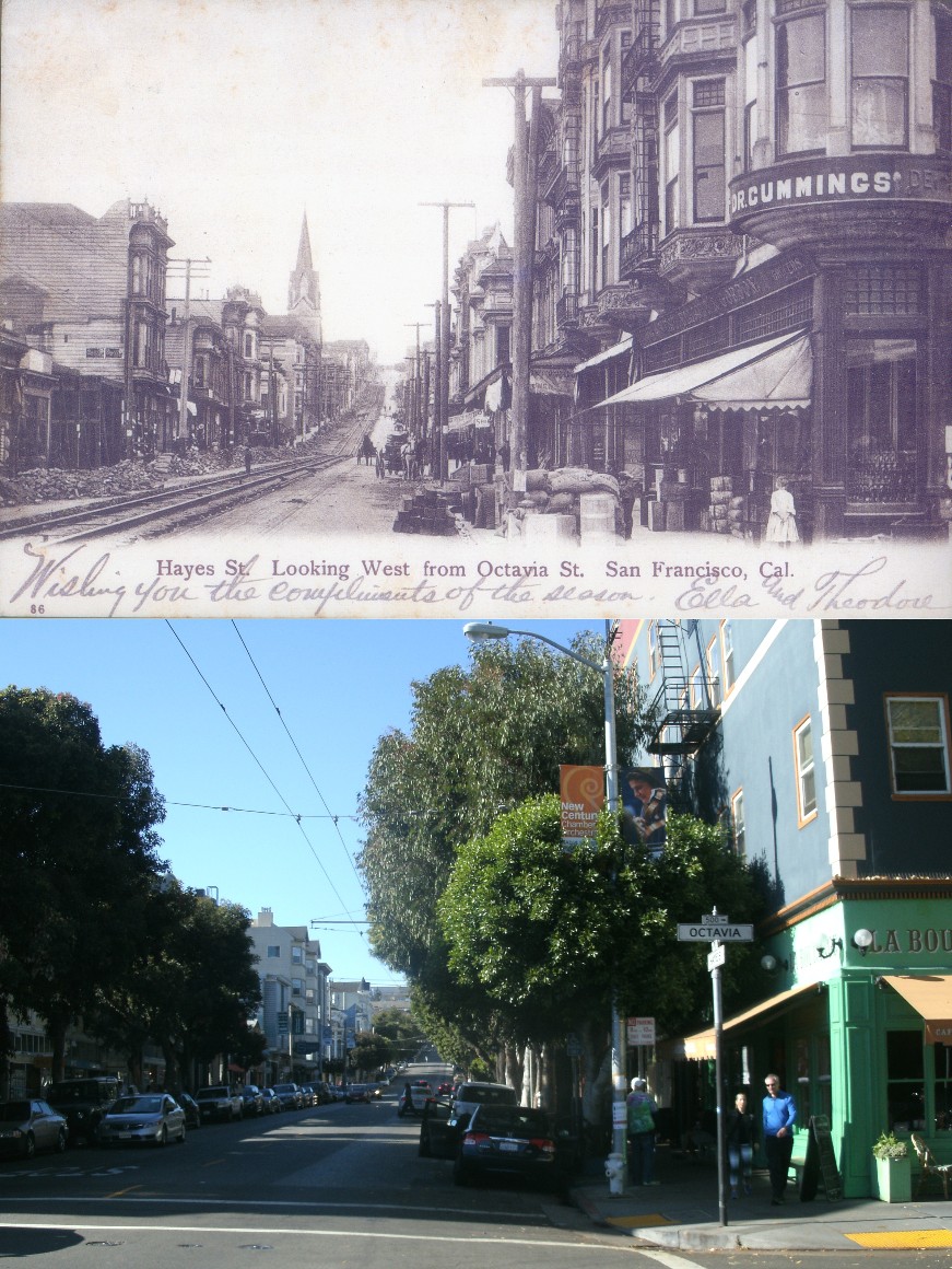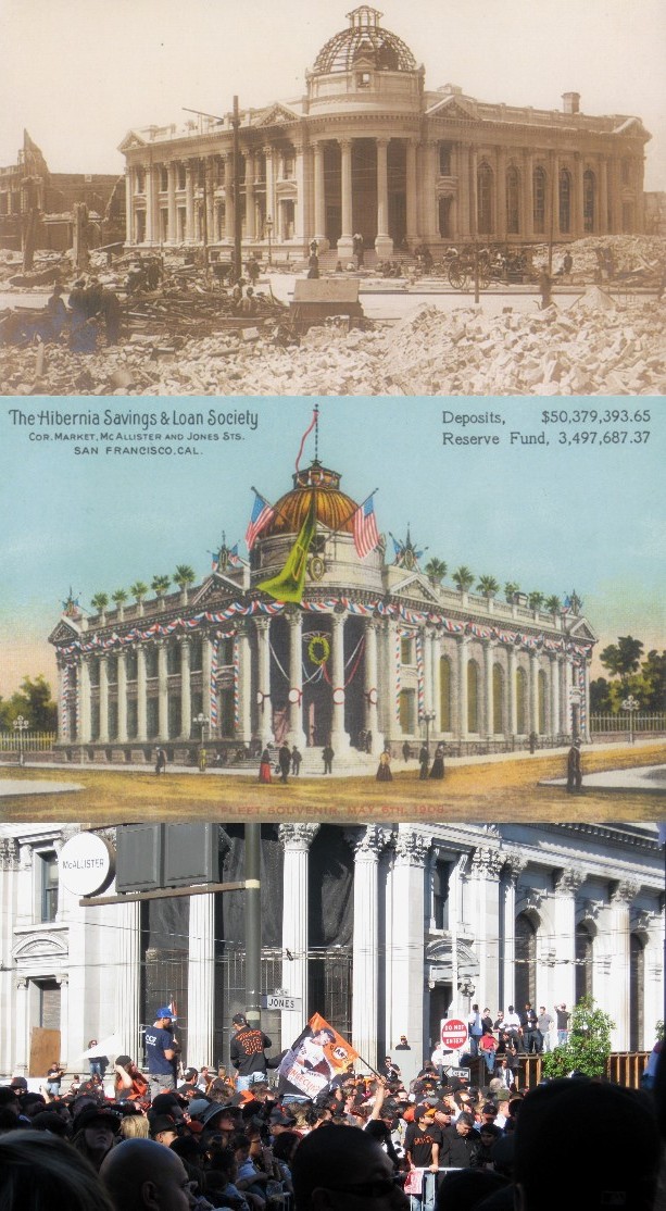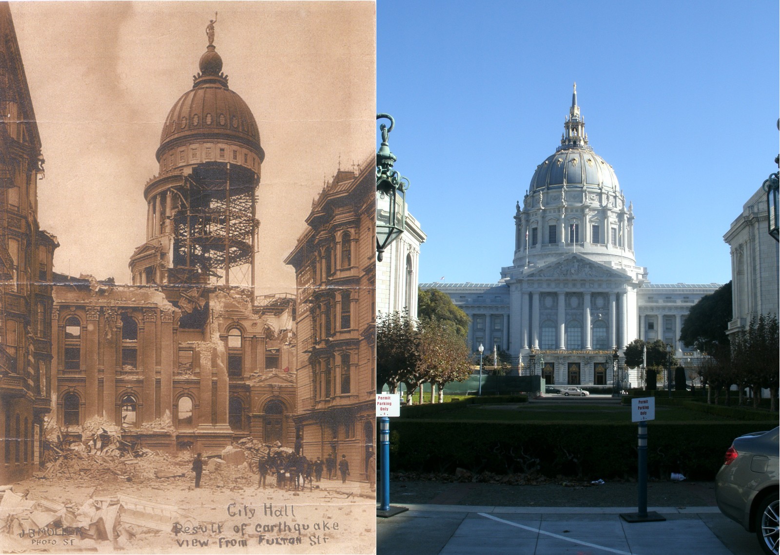 The old City Hall, destroyed in less than one minute in the 1906 Earthquake, from Fulton and Franklin Streets, and the new City Hall from Fulton and Franklin. The two buildings bordering the old City Hall were almost certainly destroyed by the fire to come that burned down most of San Francisco. The two buildings the City Hall is seen between today are The War Memorial Building on the left where the United Nations was formed, and the Opera House on the right. (Thumbnail image)