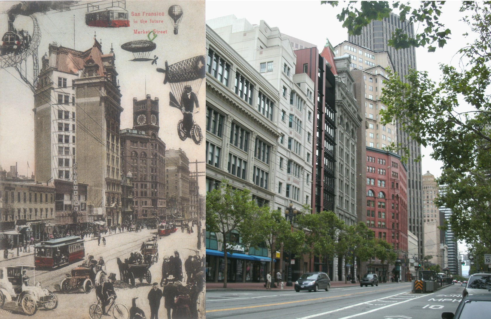Some interesting San Francisco buildings. At the left: The fictional building that would soon catch fire in the 1974 blockbuster ‘The Towering Inferno’. I still don’t know how this movie won an Oscar for cinematography! The Bank of America Building on California where some of the movie was filmed is, usually, a dark brown monolithic looking thing, but if you take a picture at the right spot, and the right time of day, it makes a good comparison. Second from the left: This image from some remarkable live footage at the Ferry Building was taken on Market Street the day after the 1906 Earthquake. For reasons that I’ve never really understood, the Ferry Building does not face Market Street squarely. That’s just one of those things I’ve always known, but never thought much about until now! Second from the right: I don’t know who lives in the mansion at 2898 Broadway in Pacific Heights. Probably, somebody with a stately name like Mrs. Basington-Basington or something, but it was used as the setting of Lana Turner’s home in the 1960 crime thriller ‘Portrait in Black’. At the right: The Columbus and Kearny intersection after the 1906 Earthquake; the City goes back about its business. That’s the steel skeleton of the Columbus Tower Building, now owned by Francis Ford Coppola. To the left of it was the Montgomery Block Building, built in 1853. This haunt of just about every prominent writer to visit San Francisco from Bret Harte to Mark Twain survived the 1906 Earthquake, and was demolished in 1959. The Transamerica Pyramid now occupies the spot.