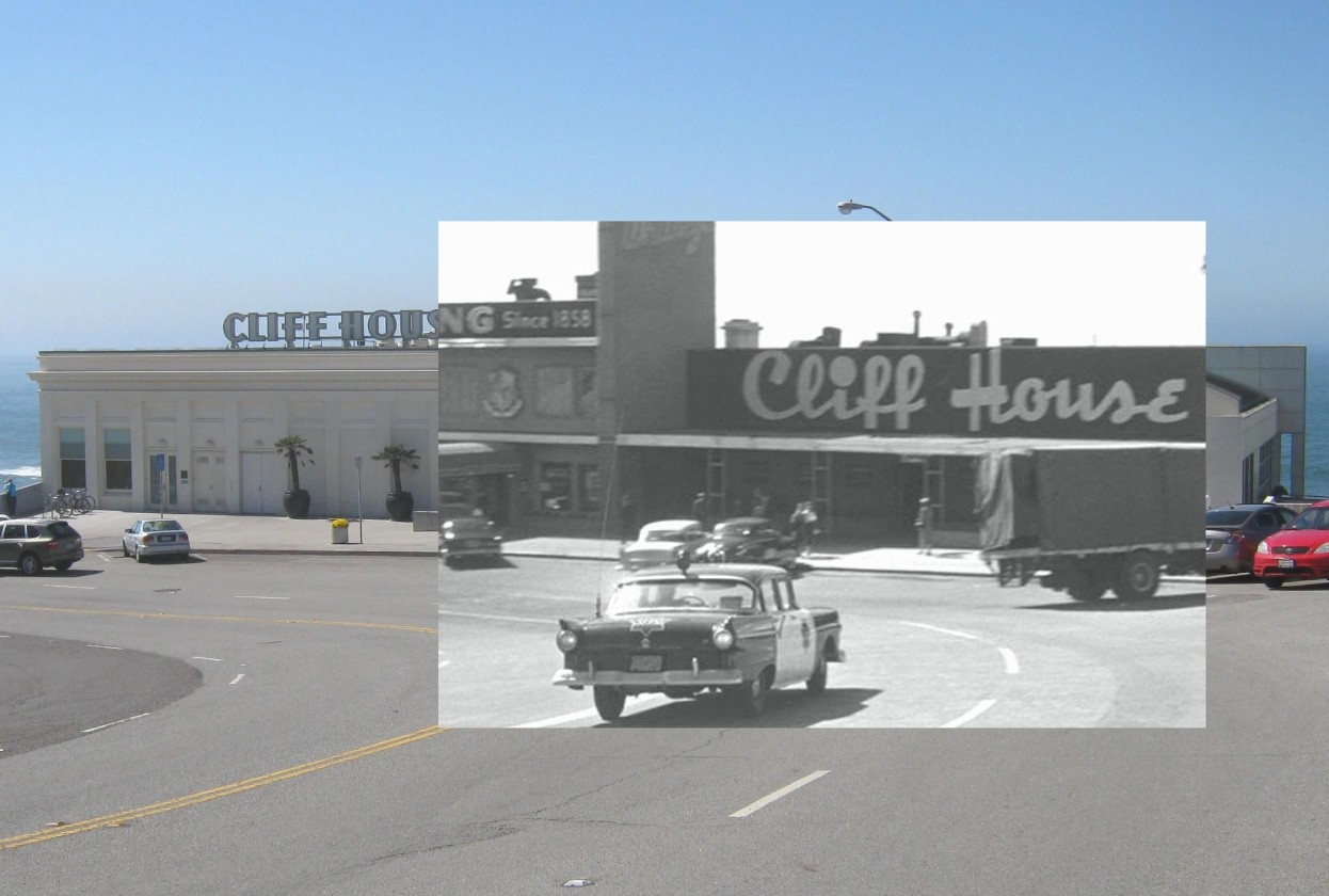 A fun technique I enjoy doing is to overlap a film scene with the present location to blend it in with the current image. Here, the police are closing in on Eli Wallach at the Sutro Baths and Cliff House in the 1958 movie ‘The Lineup’. (Thumbnail image)