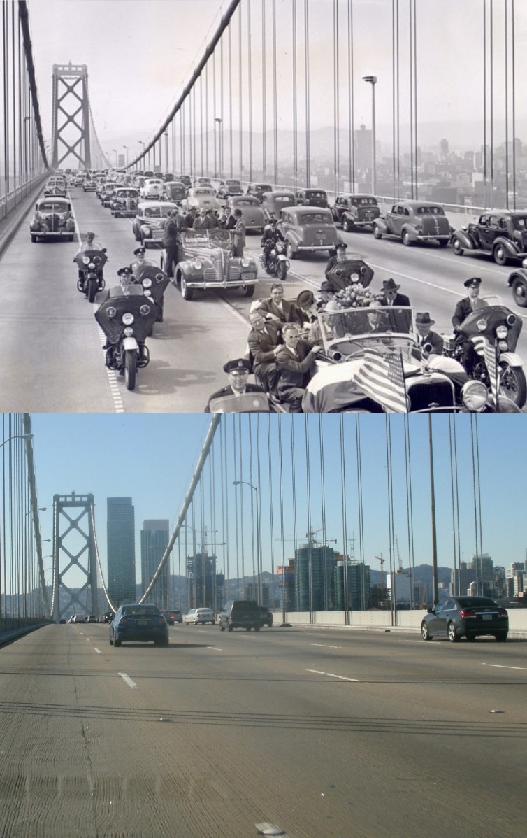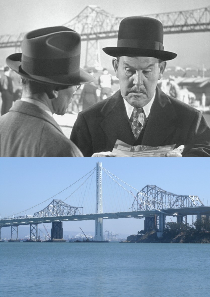 An update on a previous post of the 1939 film ‘Charlie Chan on Treasure Island’ with Charlie at Clipper Cove where the Clipper Planes arrived and left from. The new eastern portion of the Bay Bridge has been completed and the old cantilever portion is being dismantled.