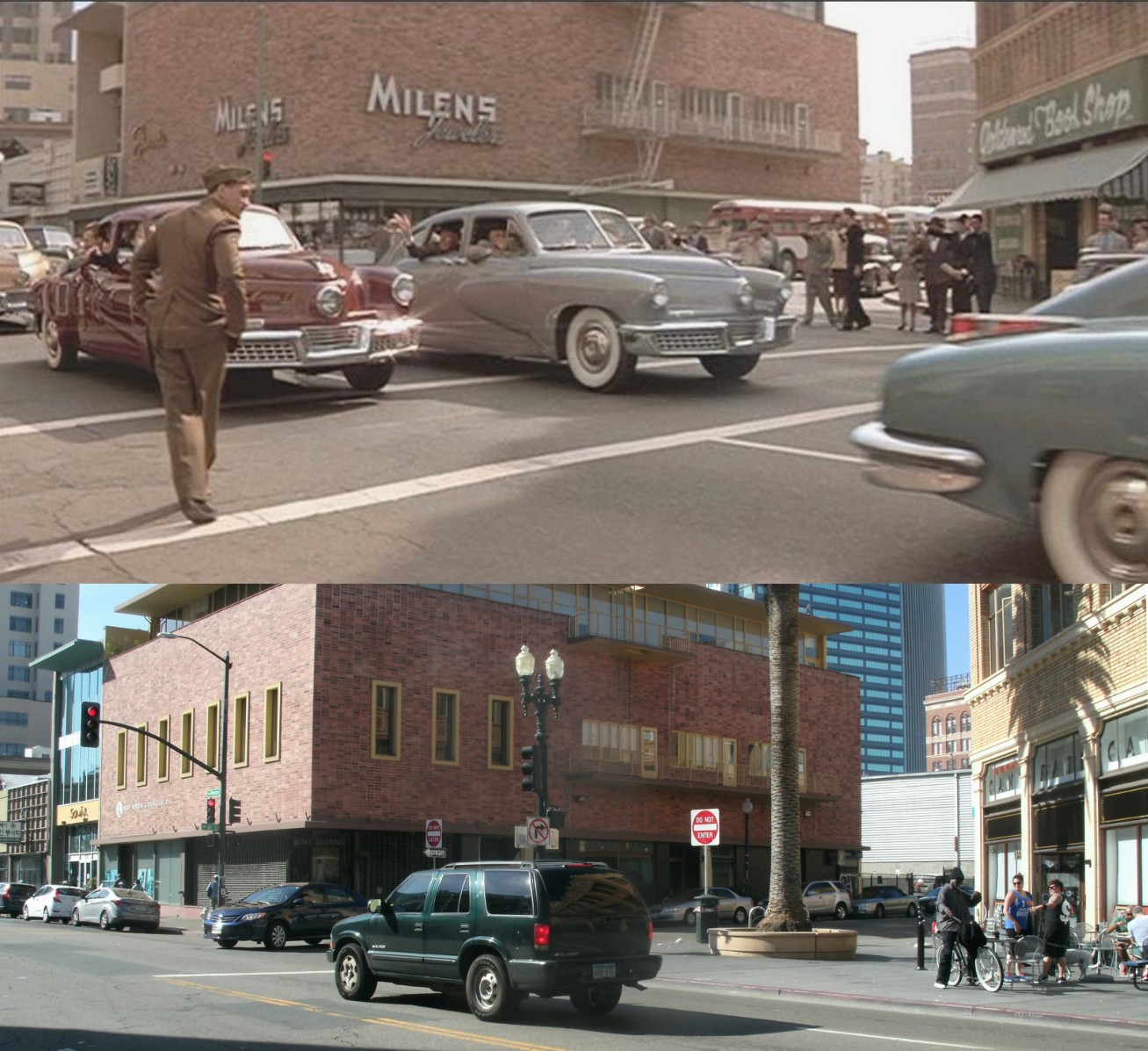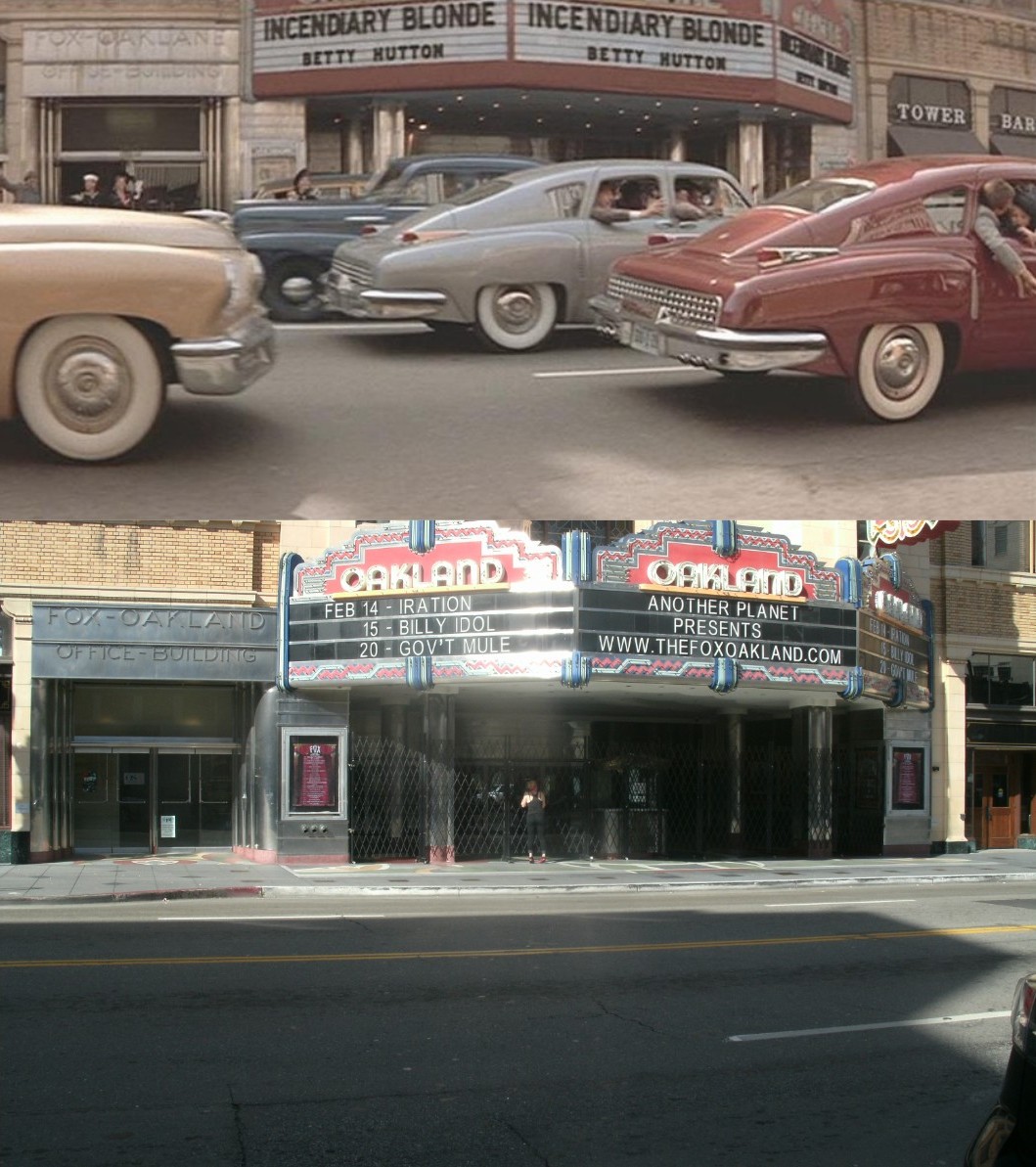 The Victory Parade scene from ‘Tucker: The Man and His Dream’ from 1988 passes the Fox Oakland Theater on Telegraph Avenue in Oakland. Because the location was supposed to be 1940’s Chicago, the wording left of the marquee was changed to FOX-OAKLANE.
