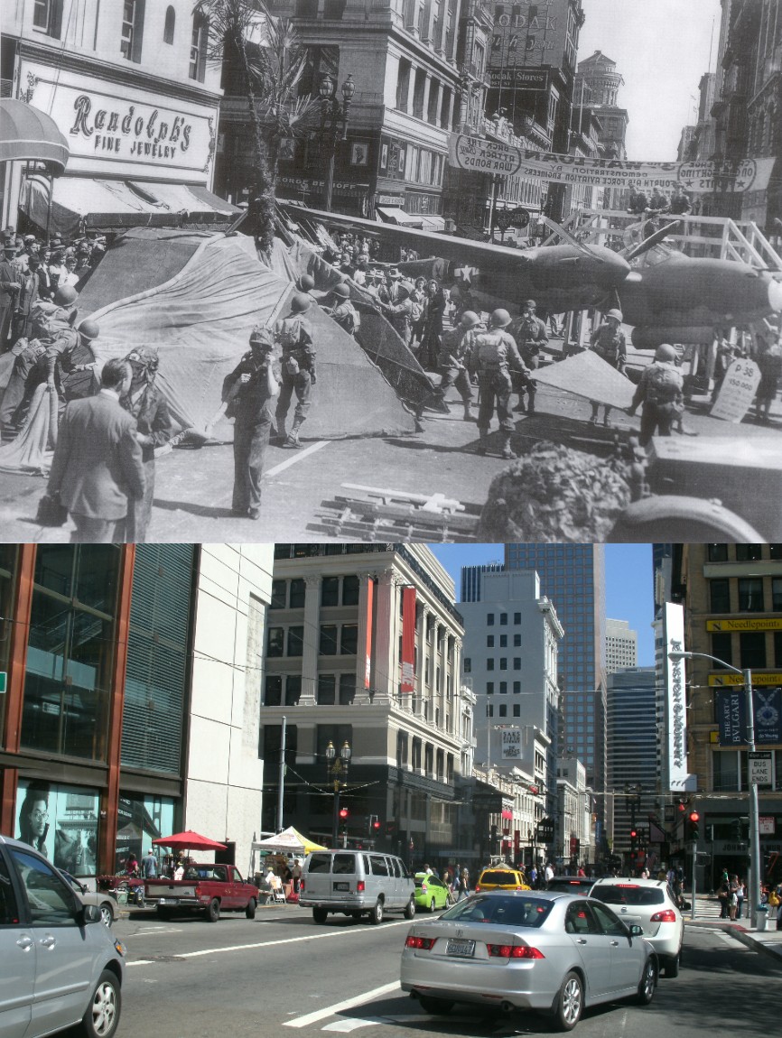 Another terrific World War ll shot! A Bond Rally at Post and Stockton in 1943. That cameraman couldn’t take pictures any straighter than I can! (Thumbnail image)