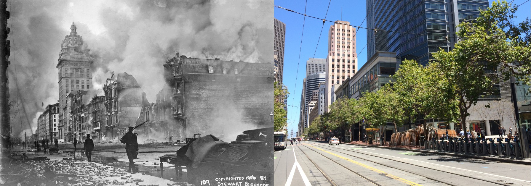 The April 18th, 1906 Earthquake and Fire, and a dramatic picture looking East on Market Street toward 3rd. (Thumbnail image)