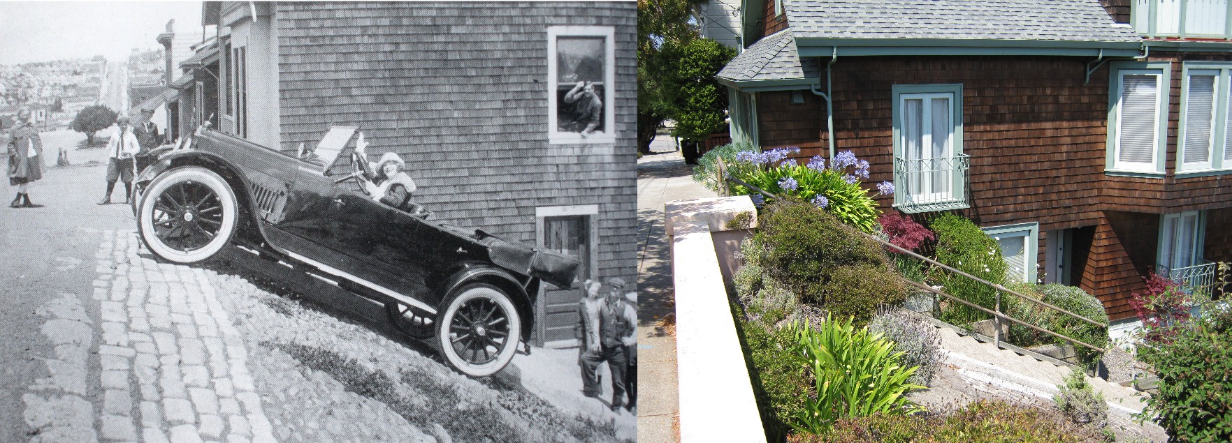 Noe Valley at the top of Duncan Street in the 1920’s. I doubt if there was an automatic tranny in the roadster, so I wouldn’t want to be standing behind her! The vintage picture is from the Images of America series. (Thumbnail image)