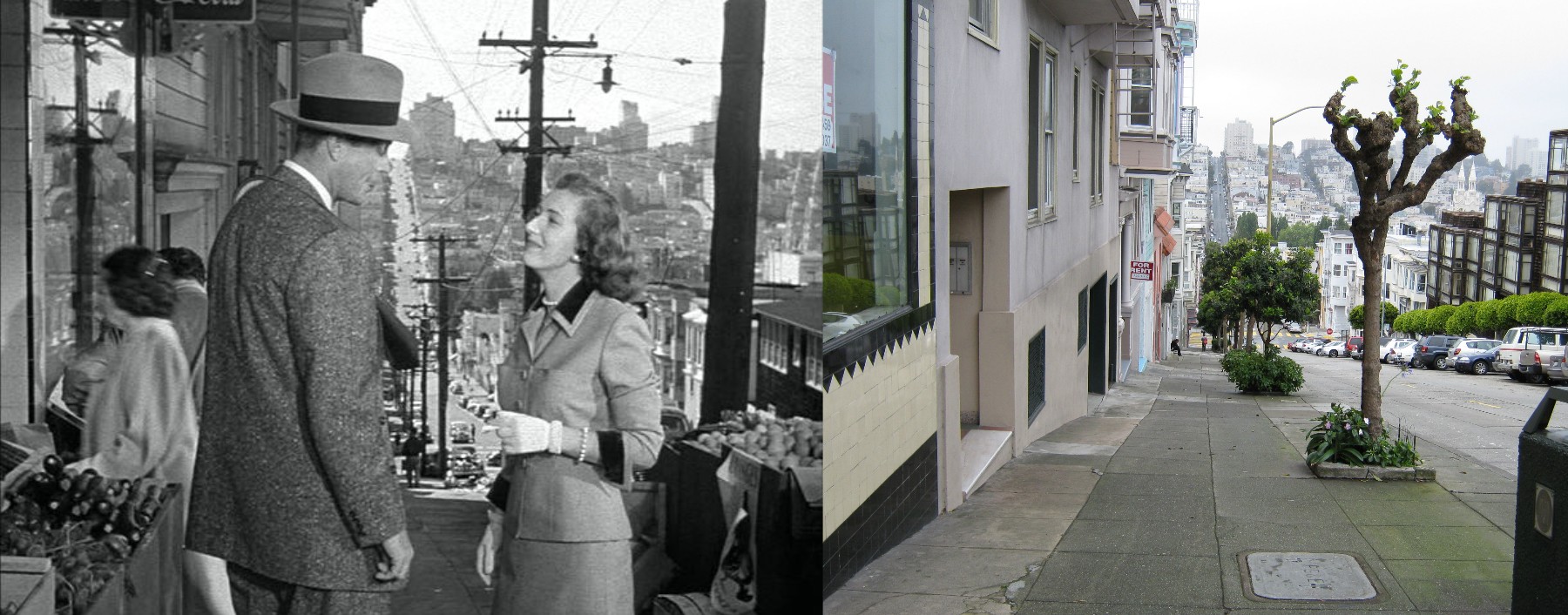 Valentina Cortese with William Lundigan at Union and Montgomery Streets in the 1951 movie ‘The House on Telegraph Hill’. That’s the old Speedy’s Market the ladies are entering in the movie scene, that closed in 2008 after 90 years on this corner. (Thumbnail image)