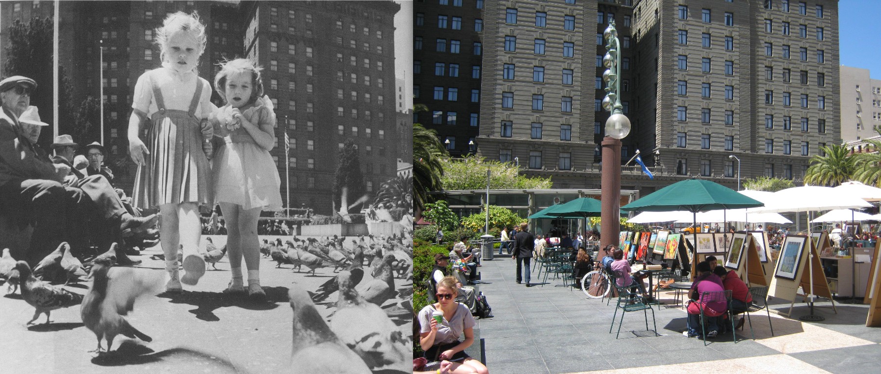 No, it’s not a scene from Hitchcock’s ‘The Birds’, just a picture at Union Square in the 1950’s. They’ve cleared the pigeons out of here now! (Thumbnail image)