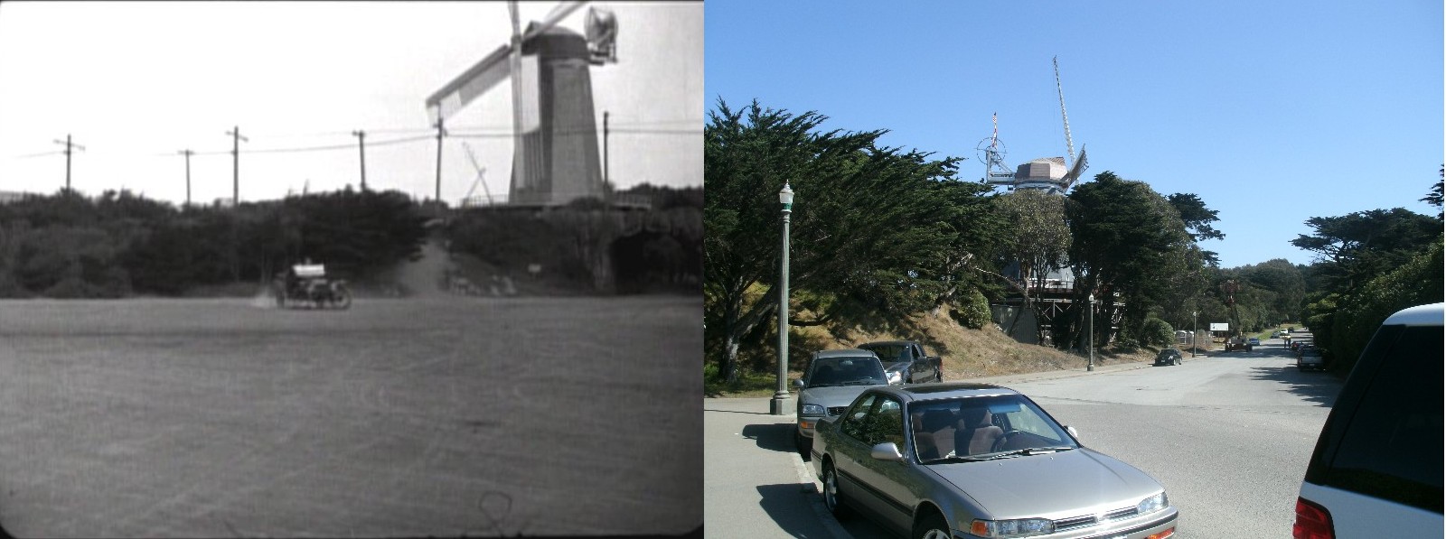 Charlie Chaplin drives under the old stone streetcar bridge and past the Murphy Windmill at the southwest end of Golden Gate Park in his 1915 short comedy ‘A Jitney Elopement’. What is now Martin Luther King Jr. Drive runs past the embankment where the bridge was today. (Thumbnail image)