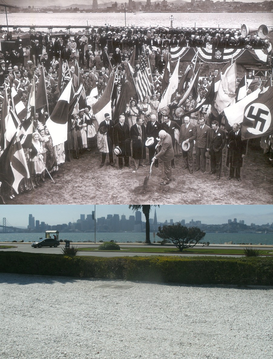 About as far east as you can get in San Francisco, is the west side of Treasure Island, seen here in 1936 for the ground breaking for the Treasure Island international Exposition that opened in 1939. Notice the flags of Nazi Germany on the right, and Japan on the left. The wheel in the sky sure turned on this one; a little more than five years later America was at war with both of those countries! (Thumbnail image)