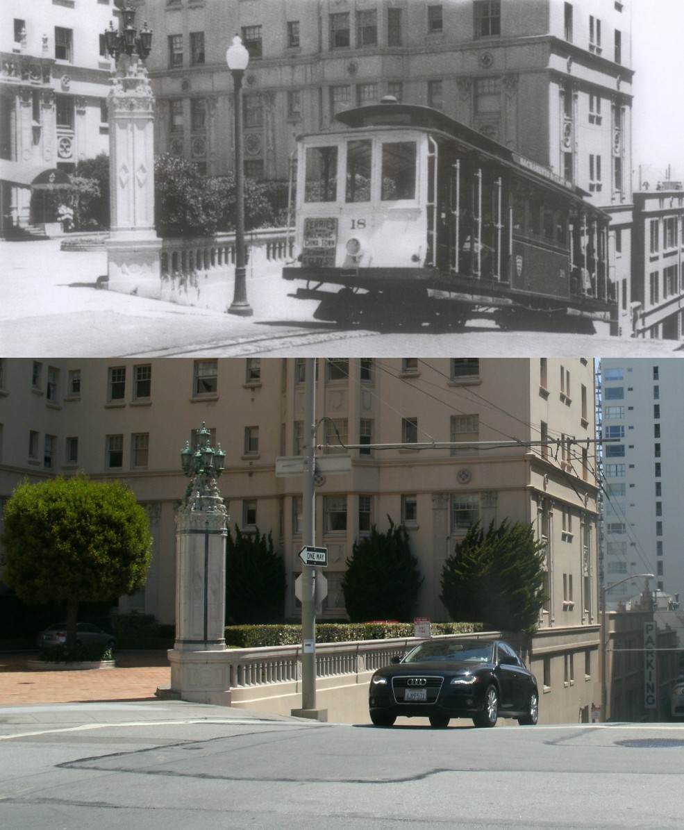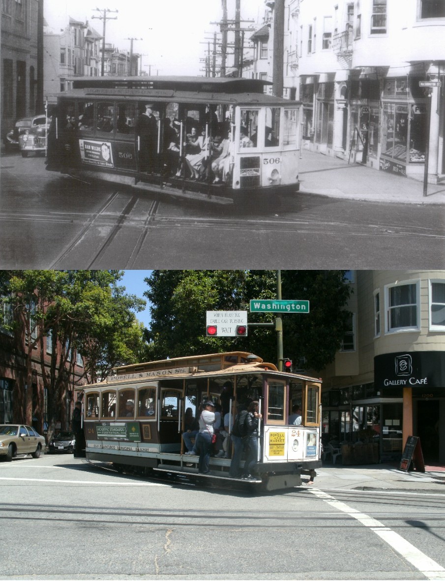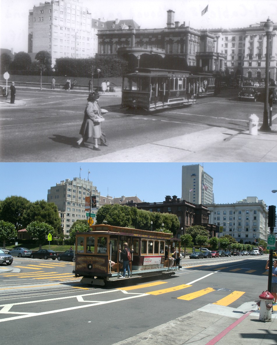 A California Street cable car passes Huntington Park, and the exclusive Pacific-Union Club on Nob Hill in the late 1940’s or early 1950’s. Not much has changed here over the years except the cars! That’s the Fairmont Hotel on the right. Grace Cathedral, out of the picture, is on the corner on the left (Thumbnail image)