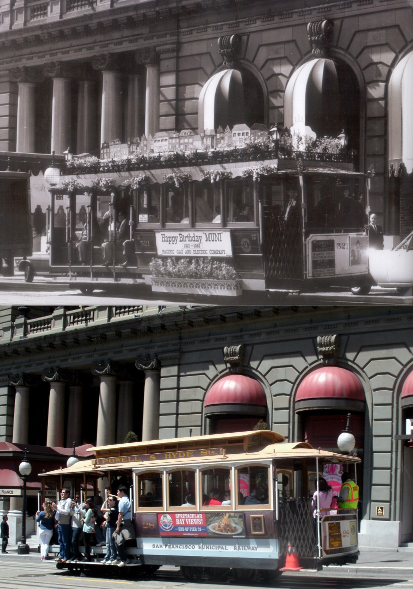 Beach Blanket Cable Car. Muni’s 50th Anniversary Celebration in 1962 in front of the St. Francis. (Thumbnail image)