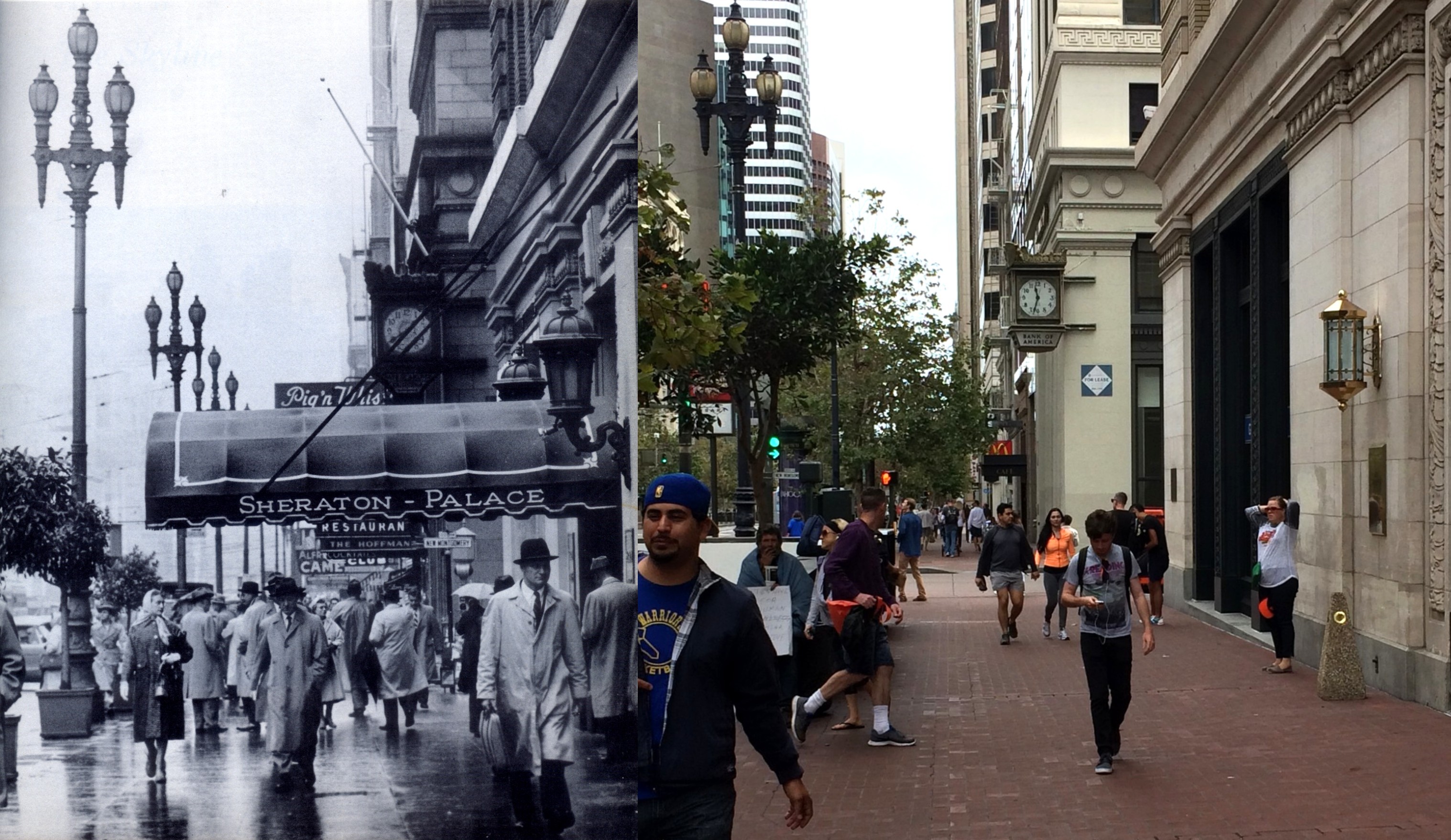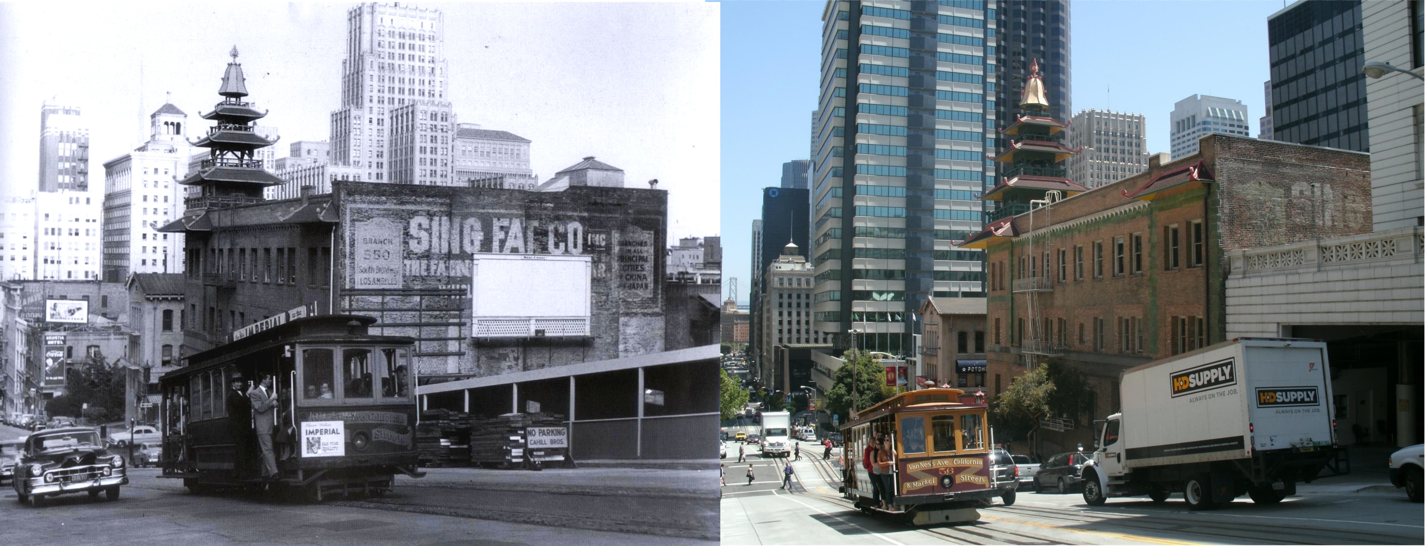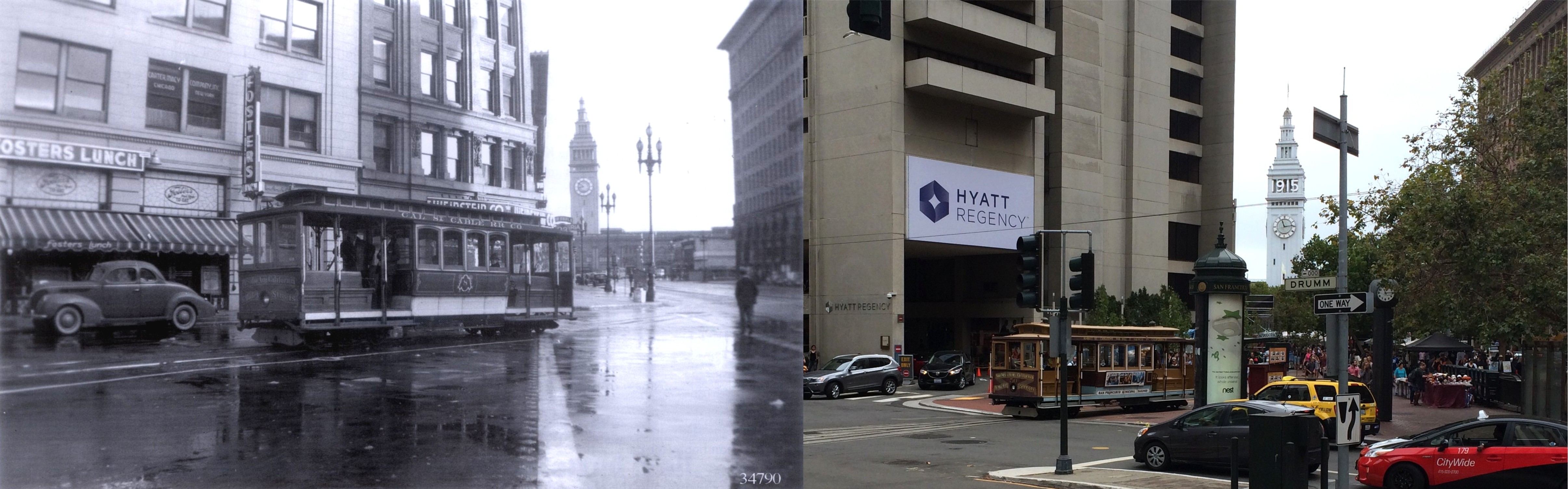 Muni, eventually, took over the cable car system as well, and it’s still part of the Municipal Railway. This is on California between Stockton and Grant. The spot where the No Parking sign is in the old picture was where the Trafalgar Building, apparently, recently demolished by the time this 1951 photo was taken, was located. Just four years before the vintage picture was taken, the opening scenes from Bob Hope’s ‘My Favorite Brunette’ were filmed here. (Thumbnail image)