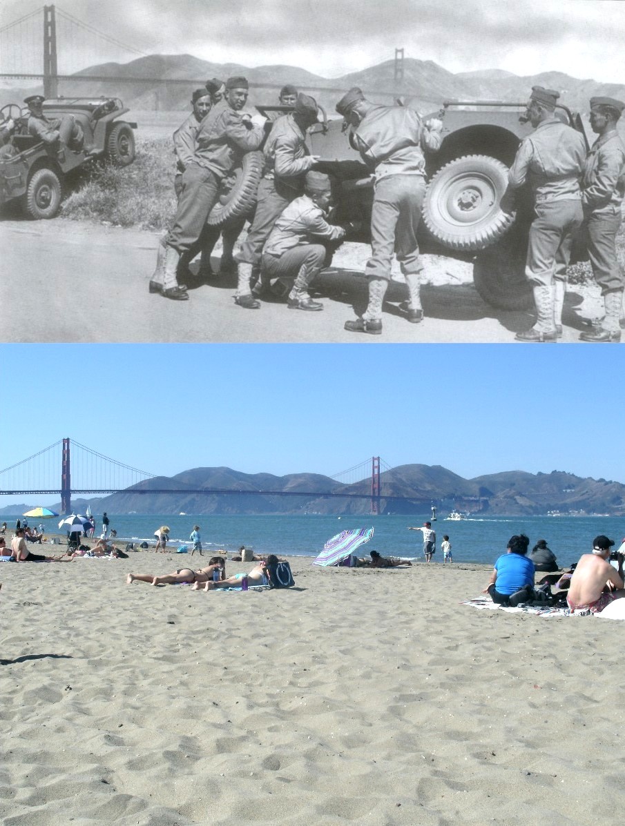 I’m not sure what the children in the photo taken on the opening day of the Golden Gate Bridge represented. Also, the NO U TURN sign doesn’t mean that the group in the bottom photo had to walk all the way to Sausalito, it’s for the cars. (Thumbnail image)