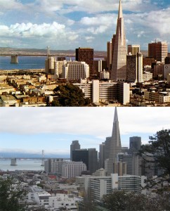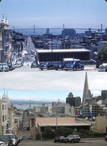 The view down Broadway from Russian Hill in 1952: The rectangle structure in the center of both pictures is the eastern entrance and exit to the Broadway Tunnel, which opened up in 1952. That building with the red, white and blue colors on the right in my picture almost looks like an optical illusion. (opensfhistory.org)