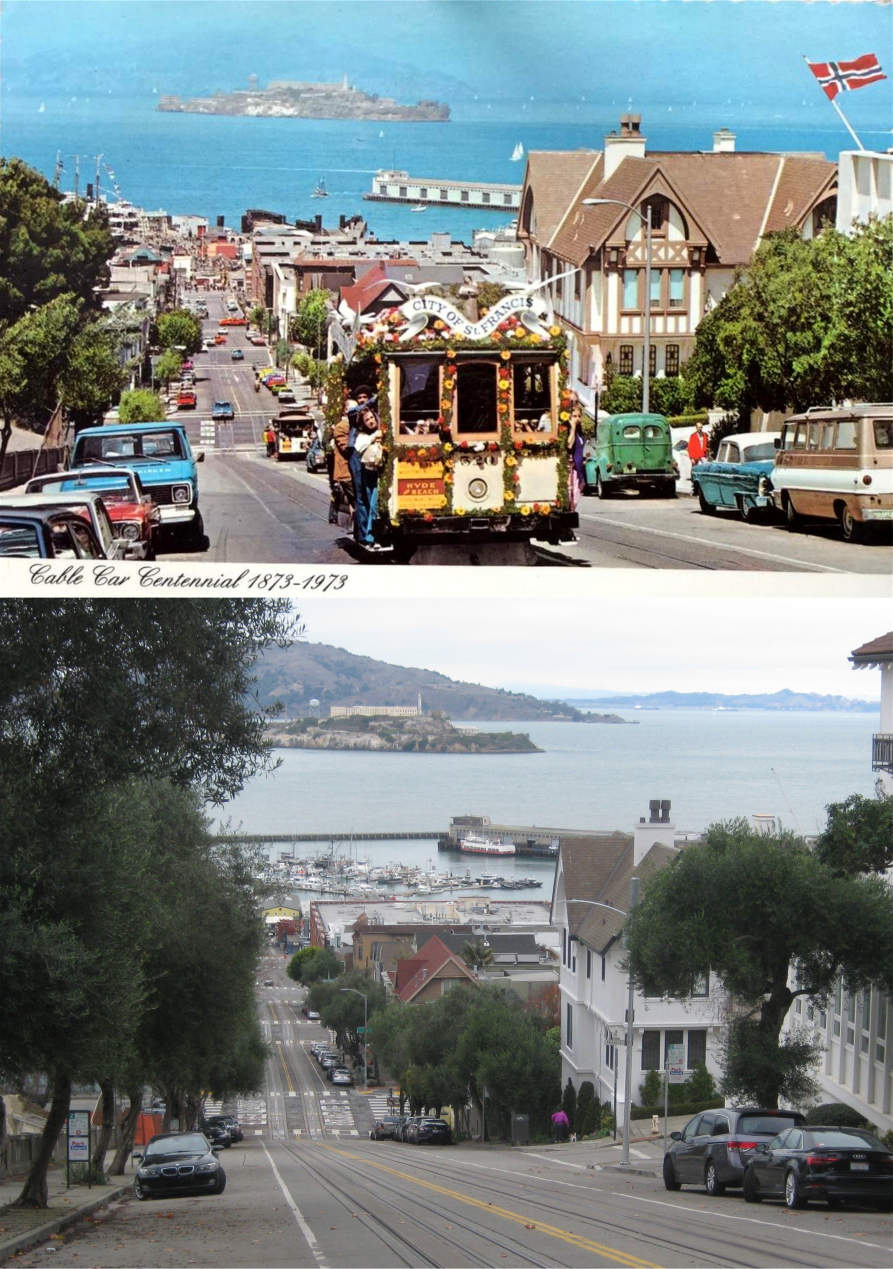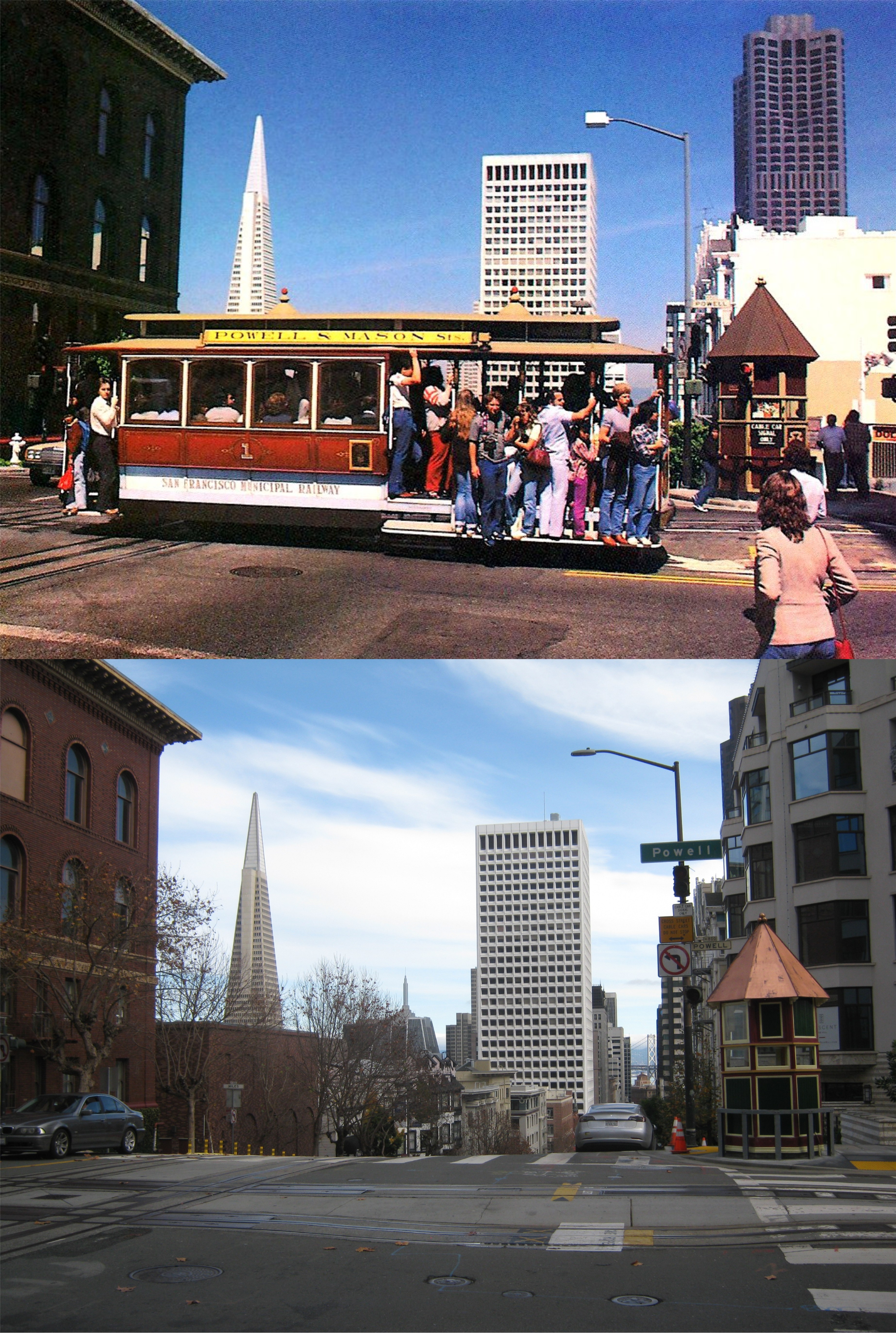 Where Powell Street crosses California Street on Nob Hill: I couldn’t get a date on the vintage picture, but it looks like the mid 1970s. (clickamericana.com)