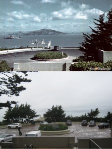 We’ll begin the climbing to the top “av owld Telygraft Hill”. That’s Wallace Irwin’s poetry for “of old Telegraph Hill”, but you’ve probably guessed that. These are views from the Coit Tower steps, pre and post Columbus Statue. Whether he massacred Native Americans or not will have to be debated by scholars; the evidence doesn’t look good for Columbus. However, while they were removing the statue in 2020, why didn’t they cut down those trees blocking the views? With Coit Tower closed indefinitely, you can’t see much from here anymore; although, you wouldn’t have been able to see much from here yesterday through the on and off rain. The vintage picture is from circa 1945. (opensfhistory.org)