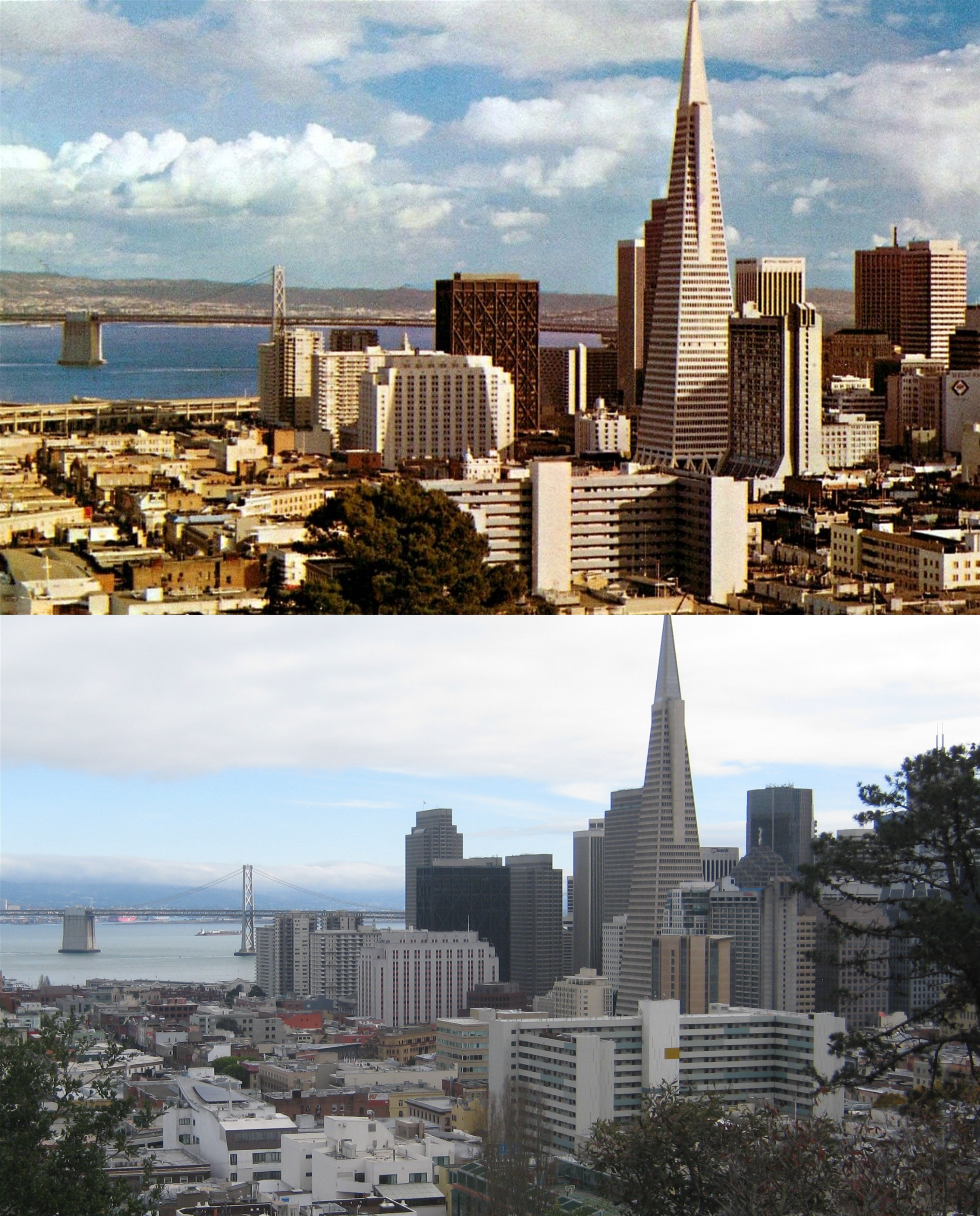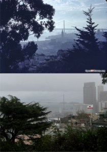 The view from Pioneer Park behind Coit Tower, circa 1945: You’ll spot the Bay Bridge and Ferry Building a little easier in the vintage picture than in my rainy redo. That was probably fog in the old picture. (opensfhistory.org)