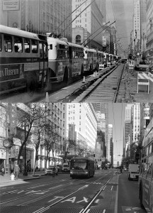 BART construction under Market Street is backing up buses between 5th and 6th Streets in 1967. Buses have it easier here today. (SF Chronicle / SF Gate)