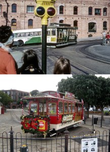 Cable cars don’t come into Aquatic Park next to the Cannery at the same spot they did in 1967. The 1982 overhaul of the system rerouted them into the park from the Beach and Hyde Streets intersection. (vintagestockphotod.com)