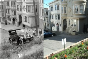 What was possibly the first stolen car incident in San Francisco occurred here on Page Street, just up from Stanyan Street and Golden Gate Park, on January 29, 1909. A Mr. C. P. Lane parked his car here and went into a building. Four kids, juveniles, jumped in the car for a joy ride. One of the kids knew how to start the automobile, and they took off. They drove down to Stanyan, turned right and then left into Golden Gate Park at Fell Street. Two mounted police officers; J. Mangan and James Harrington, spotted them and chased them on horseback. The driver Jumped out of the car and ran into the bushes and got away. The cops, who didn’t know anything about driving a car, tried to drive the kids to the station themselves in the automobile. According to John Ralston in ‘This Date in San Francisco’ the auto went off the road, crossed over ditches and flower beds, and back on to the road, careening all over the place. The three remaining kids in the car were terrified, and the officers eventually hitched the car to their horses and towed it to the Park Police Station. The three kids who were busted were sent to a Detention Home. The vintage picture at the spot where the car was stolen was taken just after the 1906 Earthquake, three years before the “boosting car” pioneer’s copper caper.(opensfhistory.org)