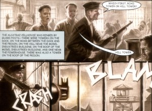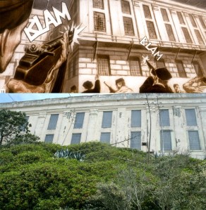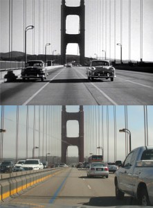 My comparison shot is from a car heading south on the Golden Gate Bridge as well as those in the film, so it’s the opposite view of the movie shot, but it lines up pretty good.