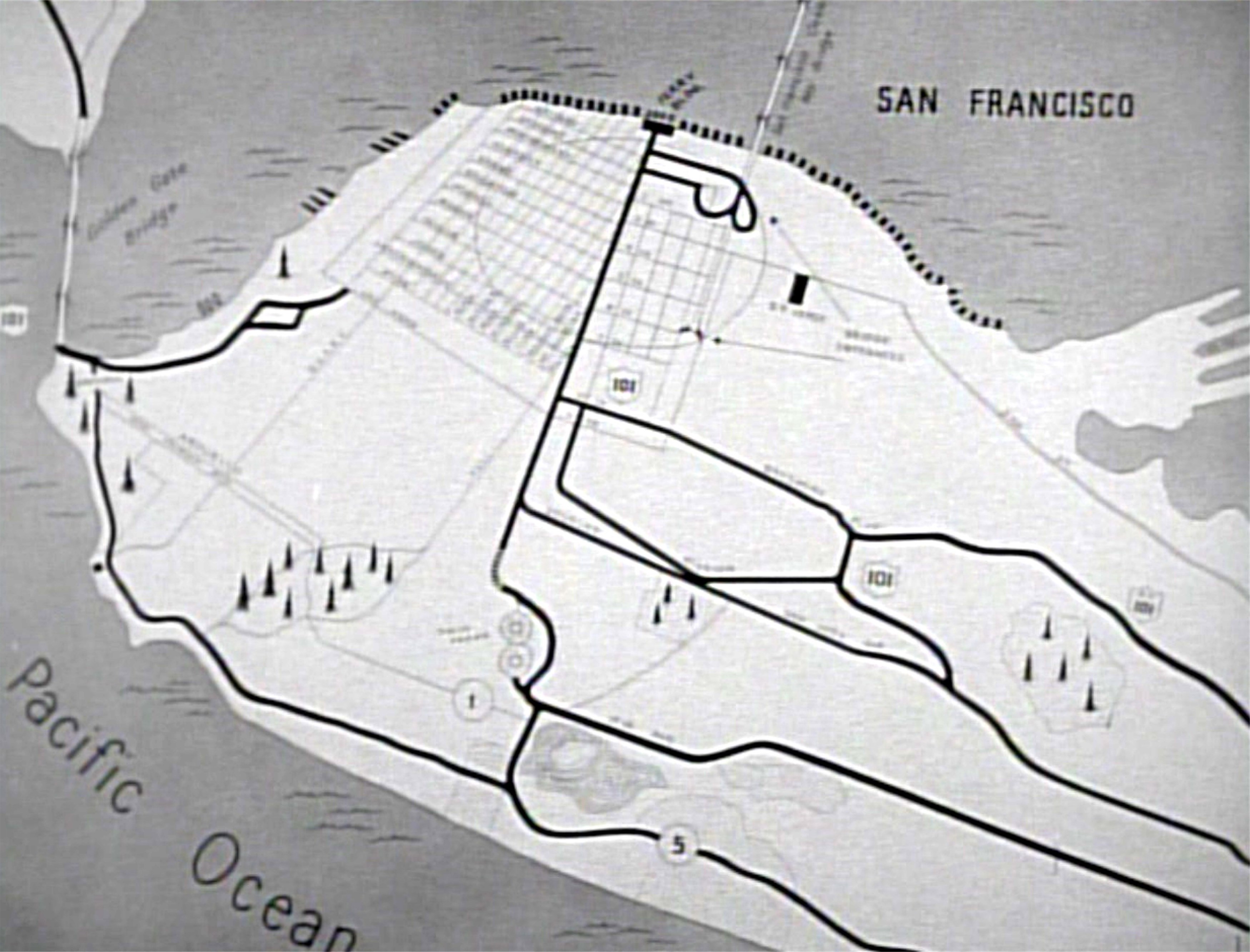 The movie switches to a silhouette of a man being smashed over the head and murdered. The narrator tells us that there is no escape from San Francisco when the police throw a dragnet around the city for you. We see a crude map of San Francisco before the movie shifts to different locations around the city as the narrator tell us that you can never get away once the police spring their trap. What’s interesting about this map is the road designated as 5 at the bottom of the picture. This was California State Route 5 that came up the western side of the peninsula, wound around Lake Merced and becomes Sloat Blvd. Opened in 1934; it’s still there today, but it was changed in 1964 to California Route 35 to avoid confusion with the opening of Interstate 5.