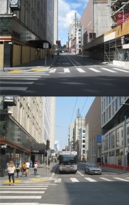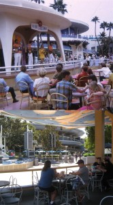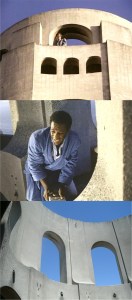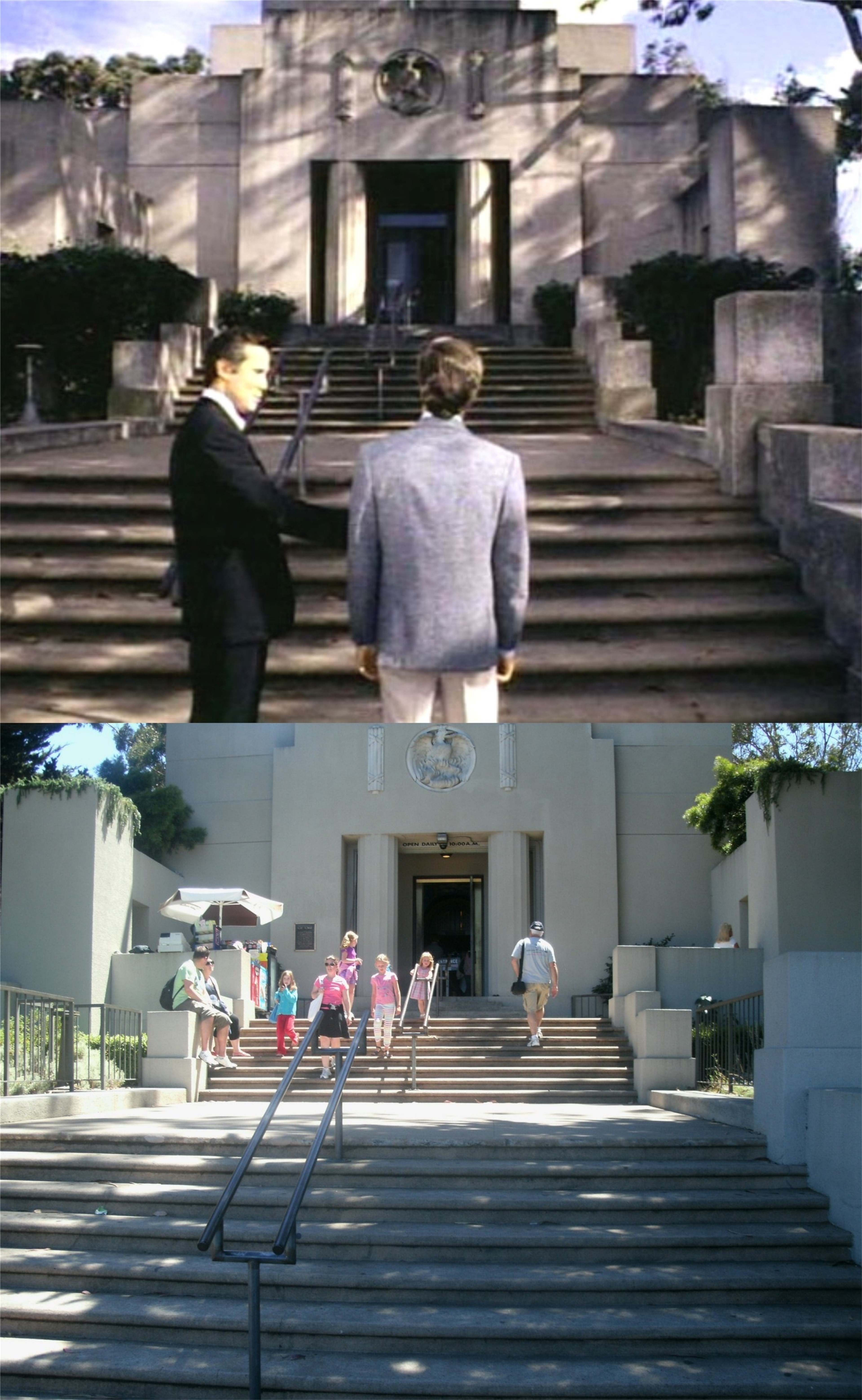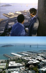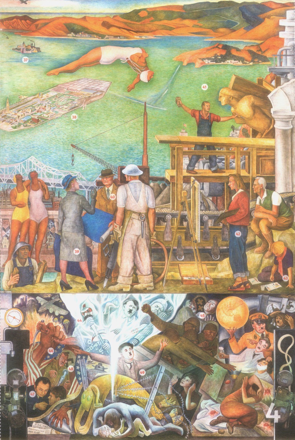 At the top right of panel number three is #28, the Golden Gate Bridge. #31 is Frida Kahlo, a beautiful Mexican artist who married Diego Rivera in 1929, was divorced from him in 1939, and remarried Diego in December of 1940, just after completion the mural. #33 is film actress Paulette Goddard helping Diego Rivera himself plant the tree shown in #2. I don’t know if Diego ever actually met Paulette Goddard. Timothy Pflueger gets an honorable appearance in #36.
