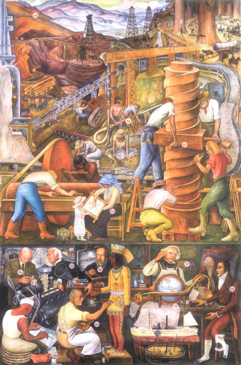 Diego Rivera leaves San Francisco in panel number five. Mounts Lassen and Shasta in Northern California are seen in #50. There’s an interesting collection of inventors and industrialists in the closing panel; Henry Ford in #54, Thomas Edison in #55, Samuel Morse in #57, and Robert Fulton in #58