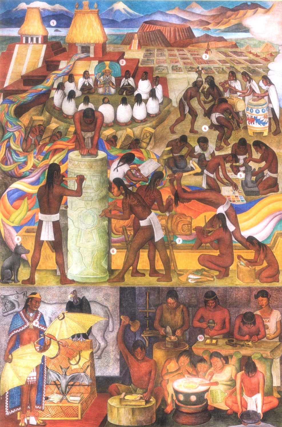 Panel number one depicts images of people and places of Rivera’s native Mexico, real and folklore, some of which I’m not familiar with. #1 are the volcanoes IxtaccihuatI and PopocatepetI to the east of Mexico City. #2 is the Aztec deity, Quetzalcoatl. #3 is the Temples of Tenochtitlan, the Aztec Capital which is now Mexico City.