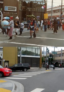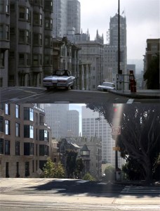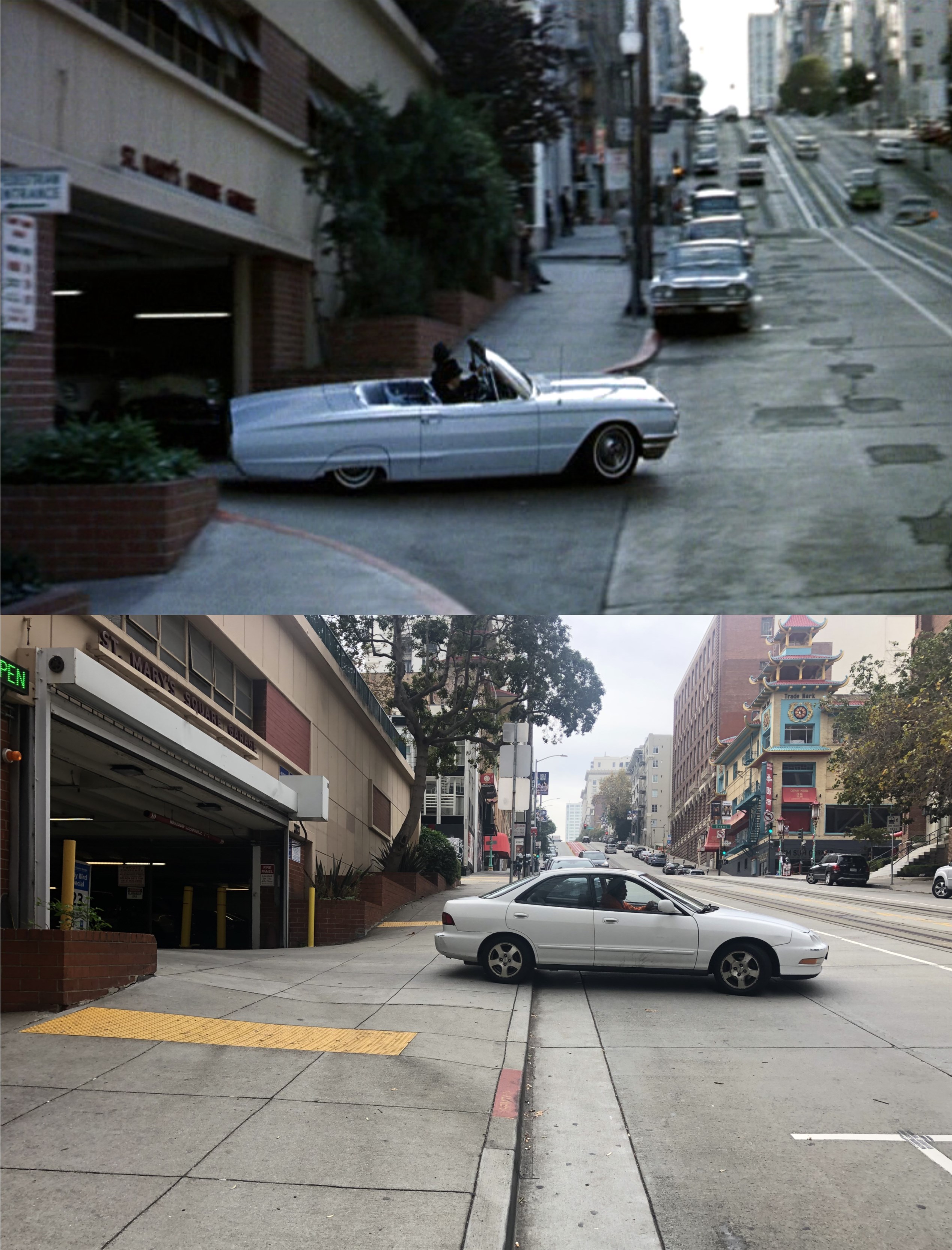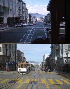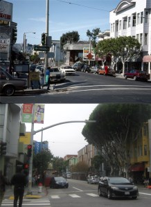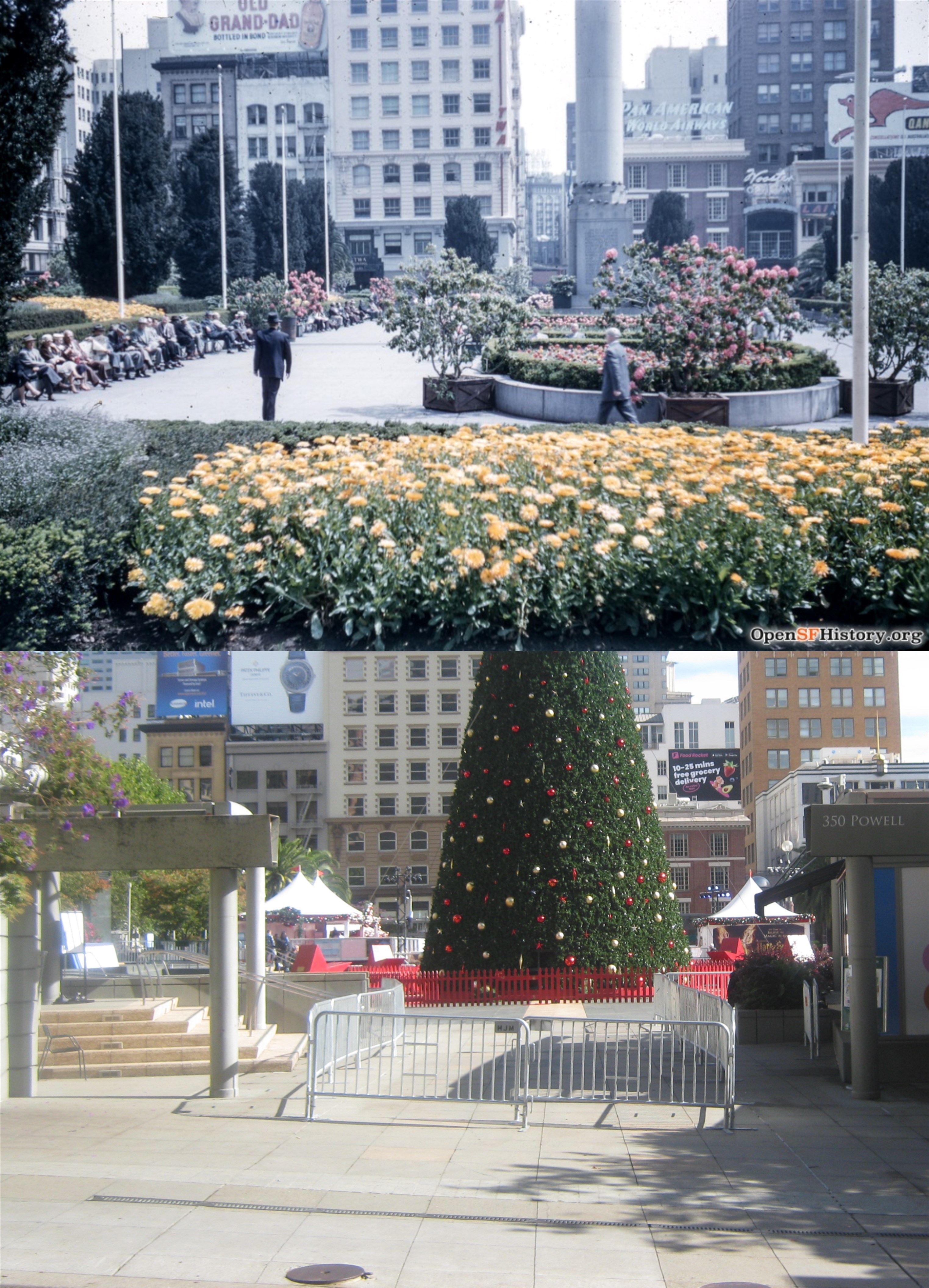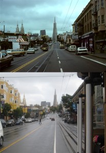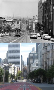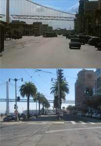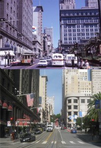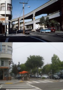 1st and Mission Streets, looking north along 1st in 1970: The southeast corner where the policeman warned us against “danger” is on the right in both pictures. I remember the Foster’s Restaurant in the vintage picture, and the old and new Transbay Terminals were out of the picture on the right. (San Francisco Pictures Blog)