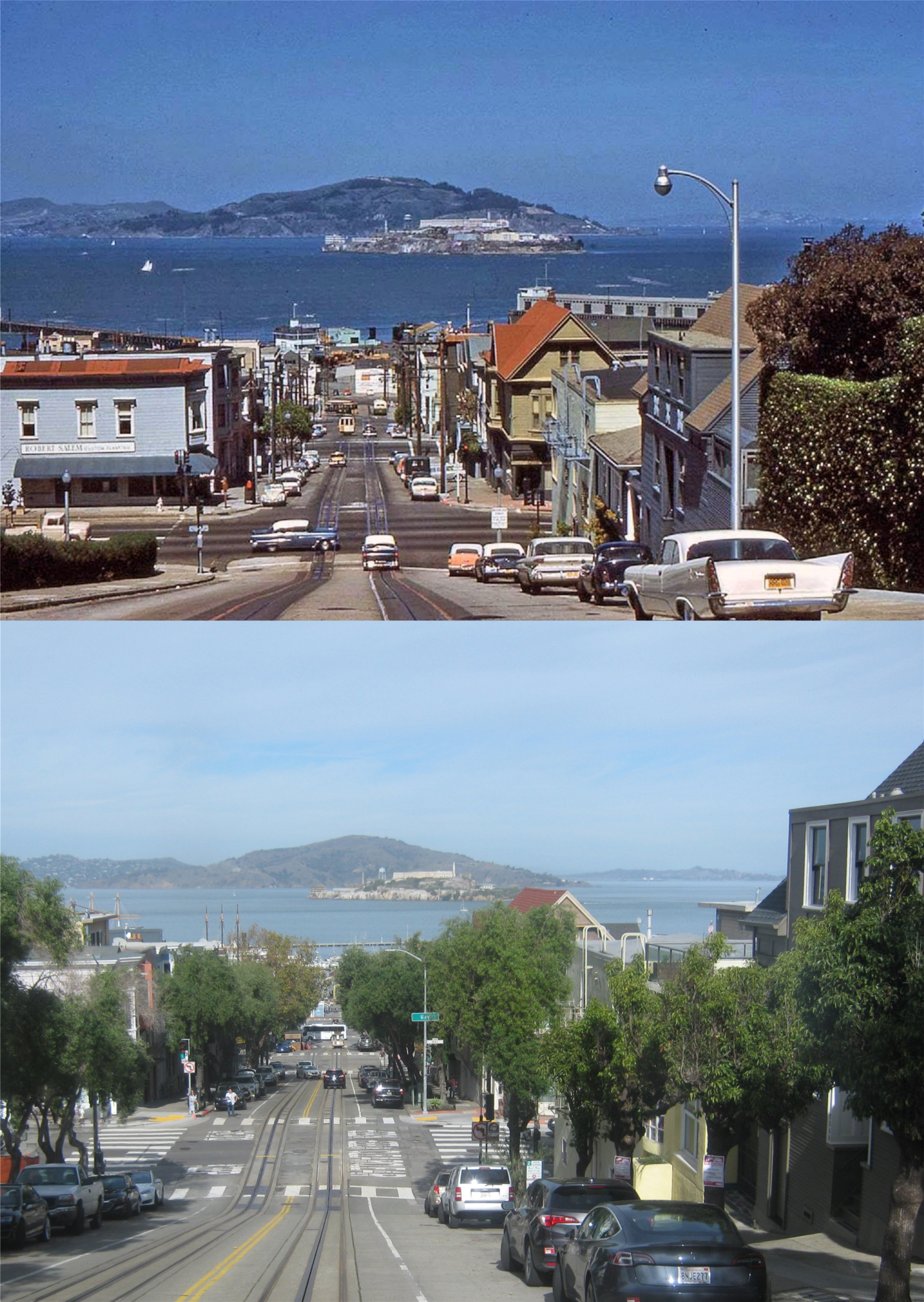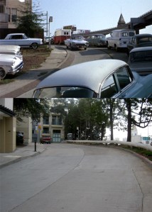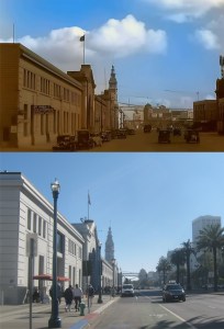 1st and Market Street in 1955: First Street, (Well, I’m not sure, so I’ll just print them both ways during this post) was one of the first streets we walked along from the old Transbay Terminal on Mission Street to get to Market Street when we first started riding the bus over to the City when we were in high school. I remember we once asked a police officer standing on the southeast corner of 1st and Mission how to get to Chinatown. He said to us, jokingly, “Why do you want to go there? Do you want to get shanghaied?” We weren’t sure what the word meant back then, but we were tough kids and we weren’t going to get shanghaied unless we wanted to. When we found out what it meant, it did kind of sound like fun. (Vintage picture, San Francisco Pictures Blog)