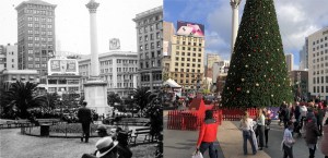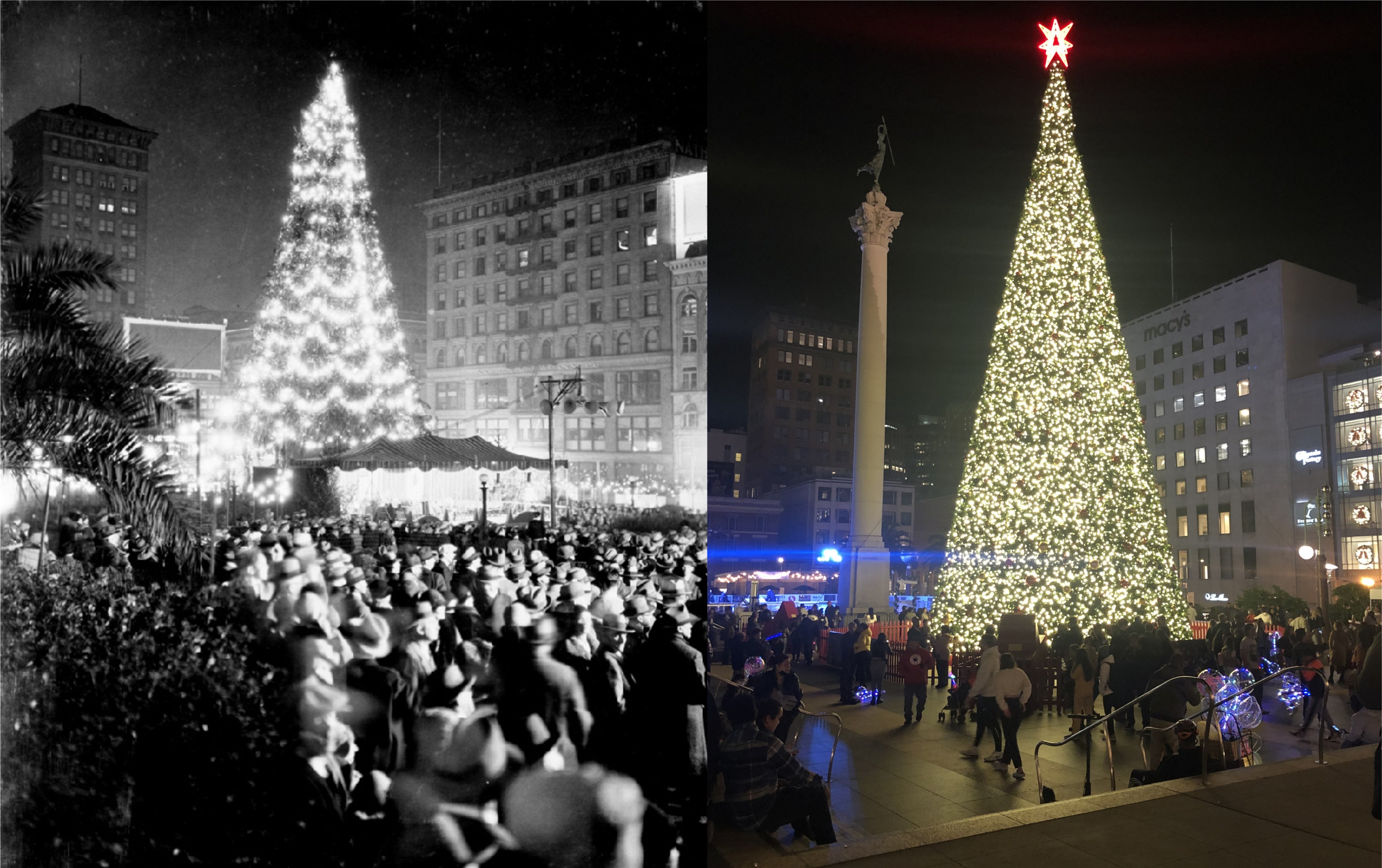 The Union Square Christmas tree in 1929 and 2021: The building on the left in the old photo is still there, the building on the right was remodeled in 1947 for the I Magnin Store. The Dewey Monument is behind the tree in the old photo. Notice how the Christmas tree in the vintage picture is warped, like a Christmas tree should be, rather than the perfect but still beautiful cone shape of the current tree. (emporernortontrust.org)