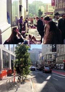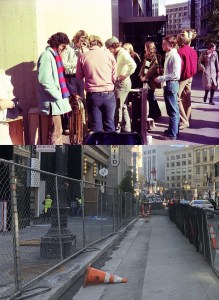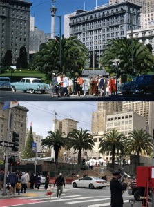 The northeast corner of Union Square in 1974: Due to the remodeling of Union Square in 2002, a perfect line up with the old photo isn’t possible anymore. (viewoftheblue.com)