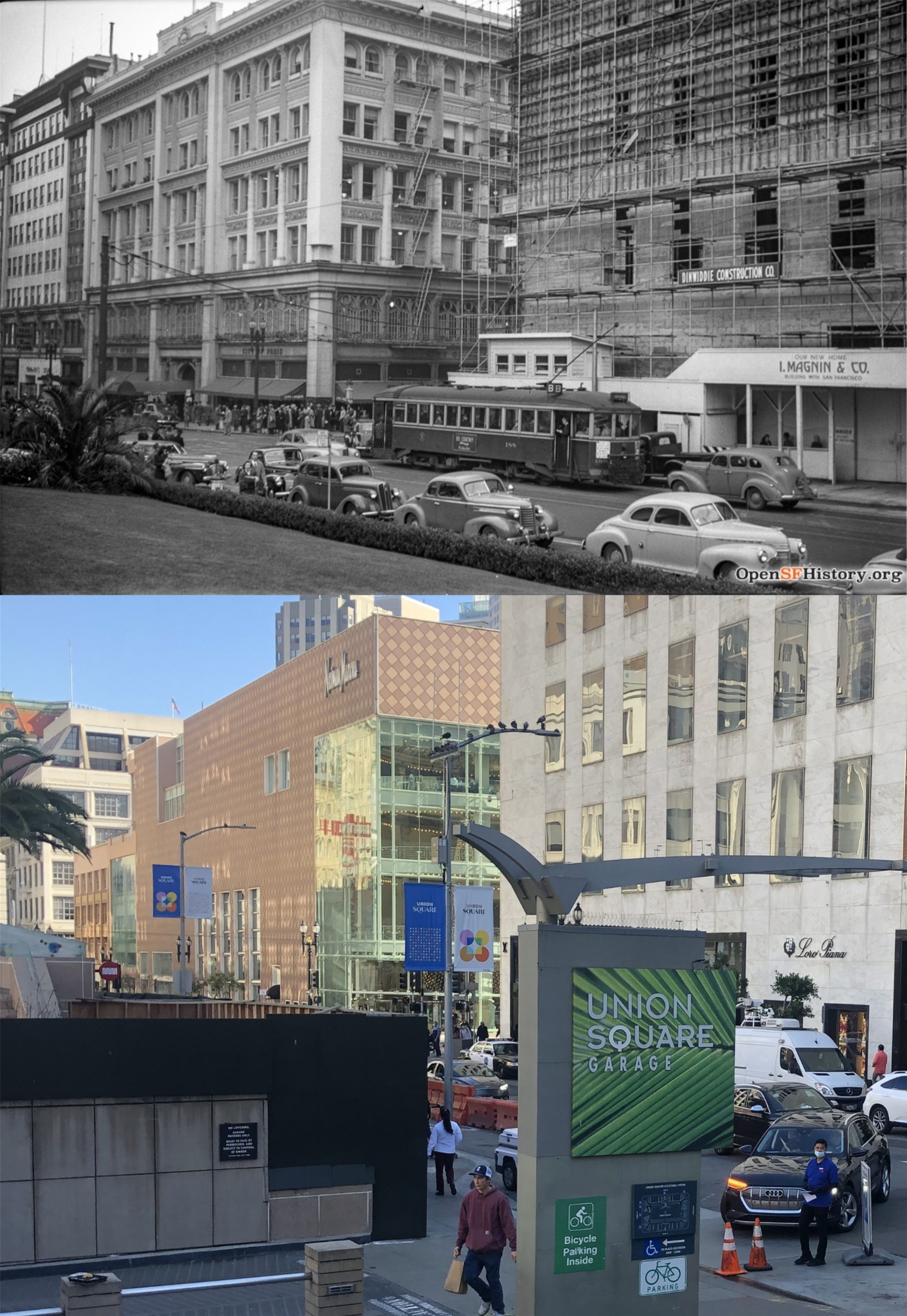 Looking along Geary St. toward Stockton Street from Union Square in 1947: The building under construction is the I Magnin Store, now a part of the Macy’s Store. (opensfhistory.org)