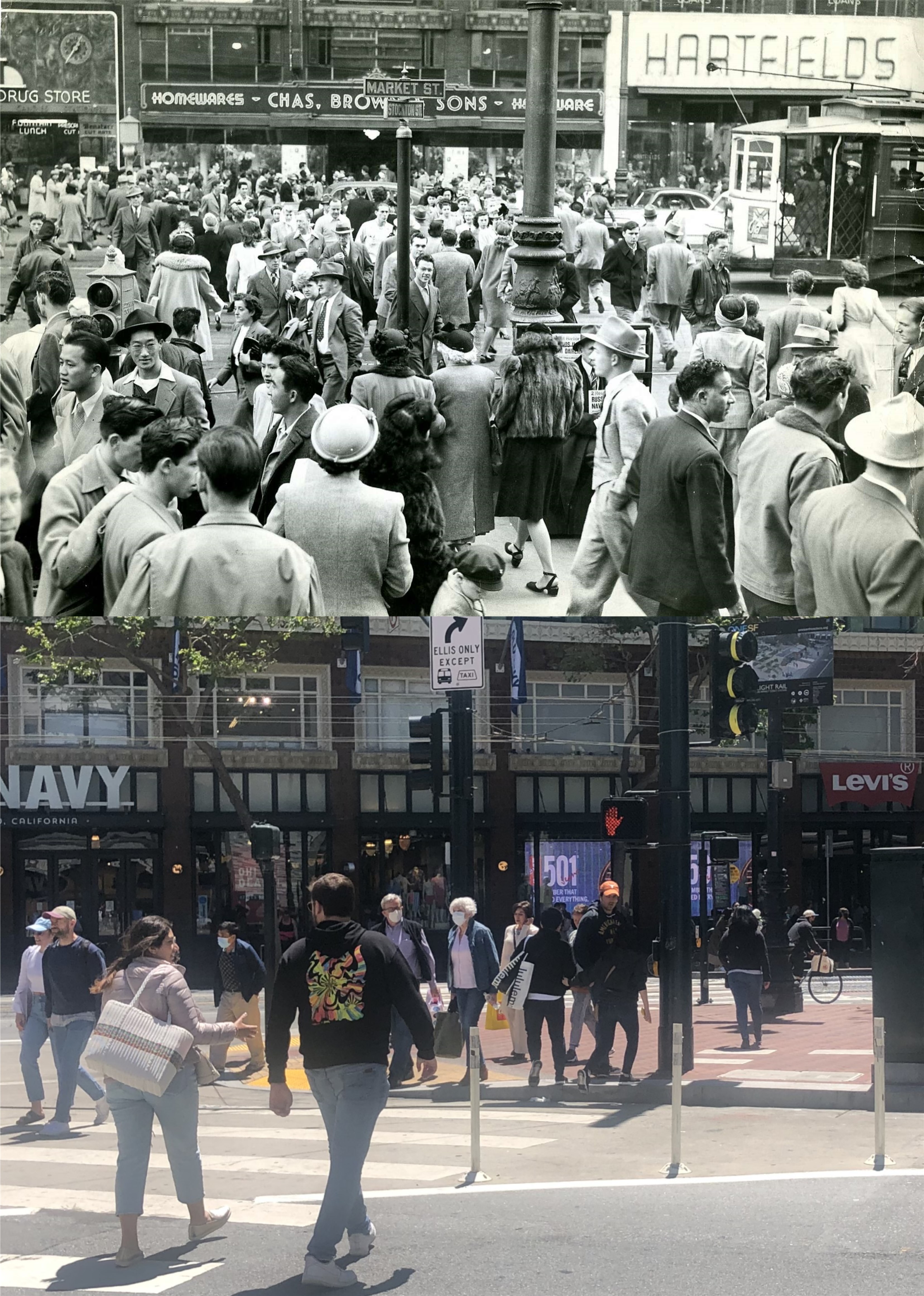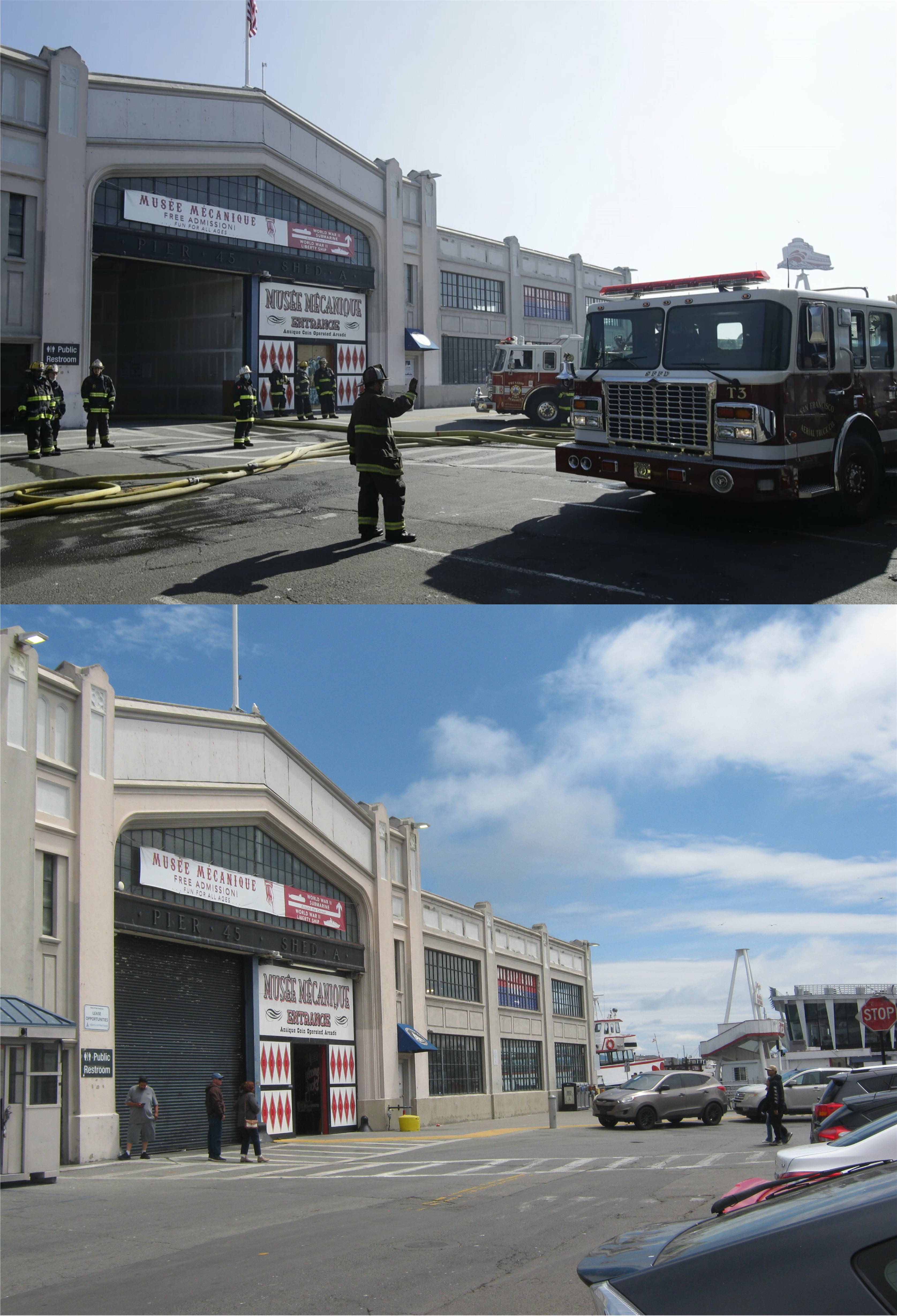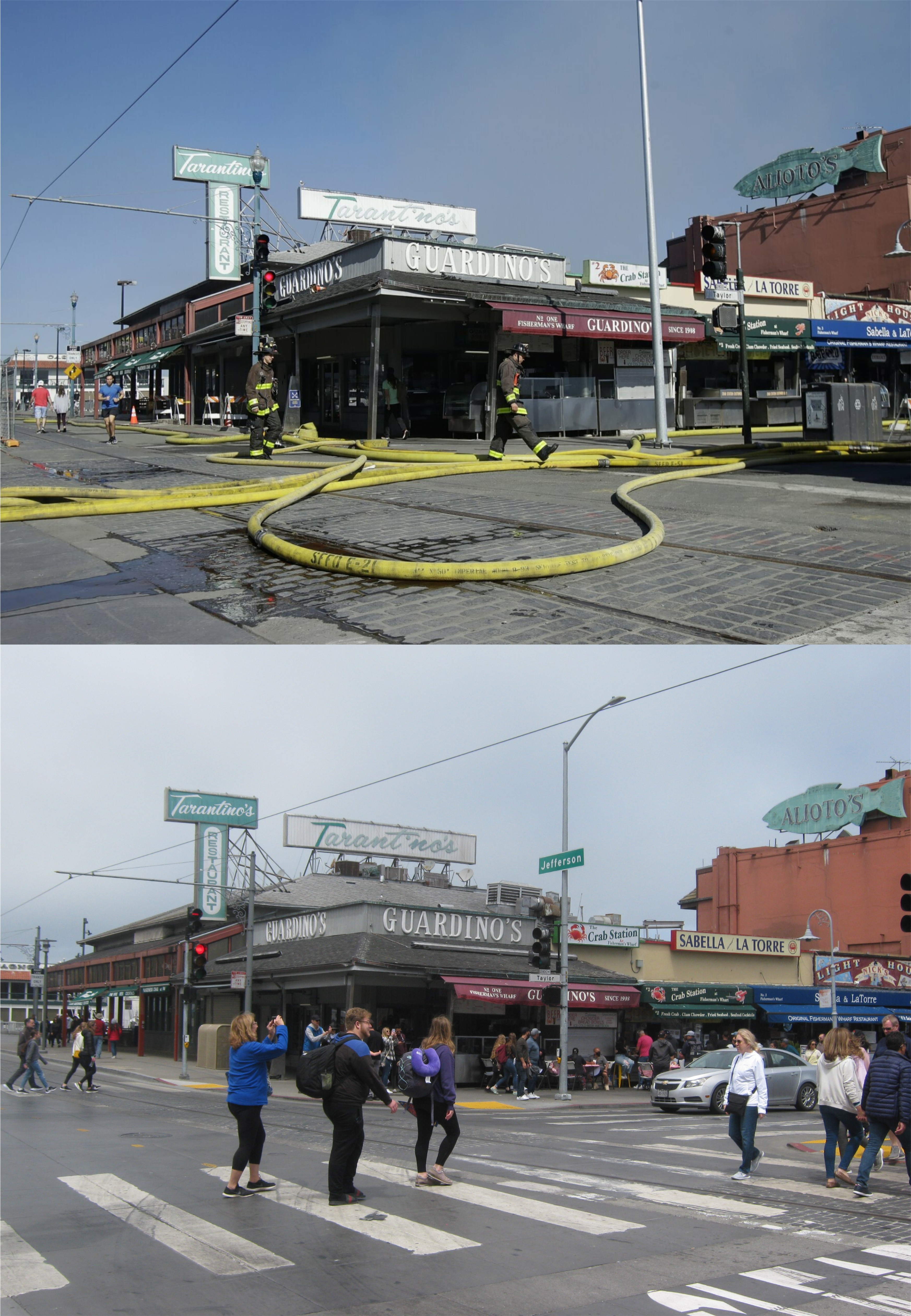 Firefighters at the intersection of Jefferson and Taylor Street, stretch hoses through Fisherman’s Wharf to try to reach Pier 45: Due to the Covid 19 shelter-in-place order issued two months earlier, Fisherman’s Wharf was nearly empty when the fire broke out. The crowds were back at the Wharf for the Memorial Day Weekend of 2022. By coincidence, I got a fire truck in my current picture looking north on Taylor Street past the Fisherman’s Wharf sign.(WTOP News)