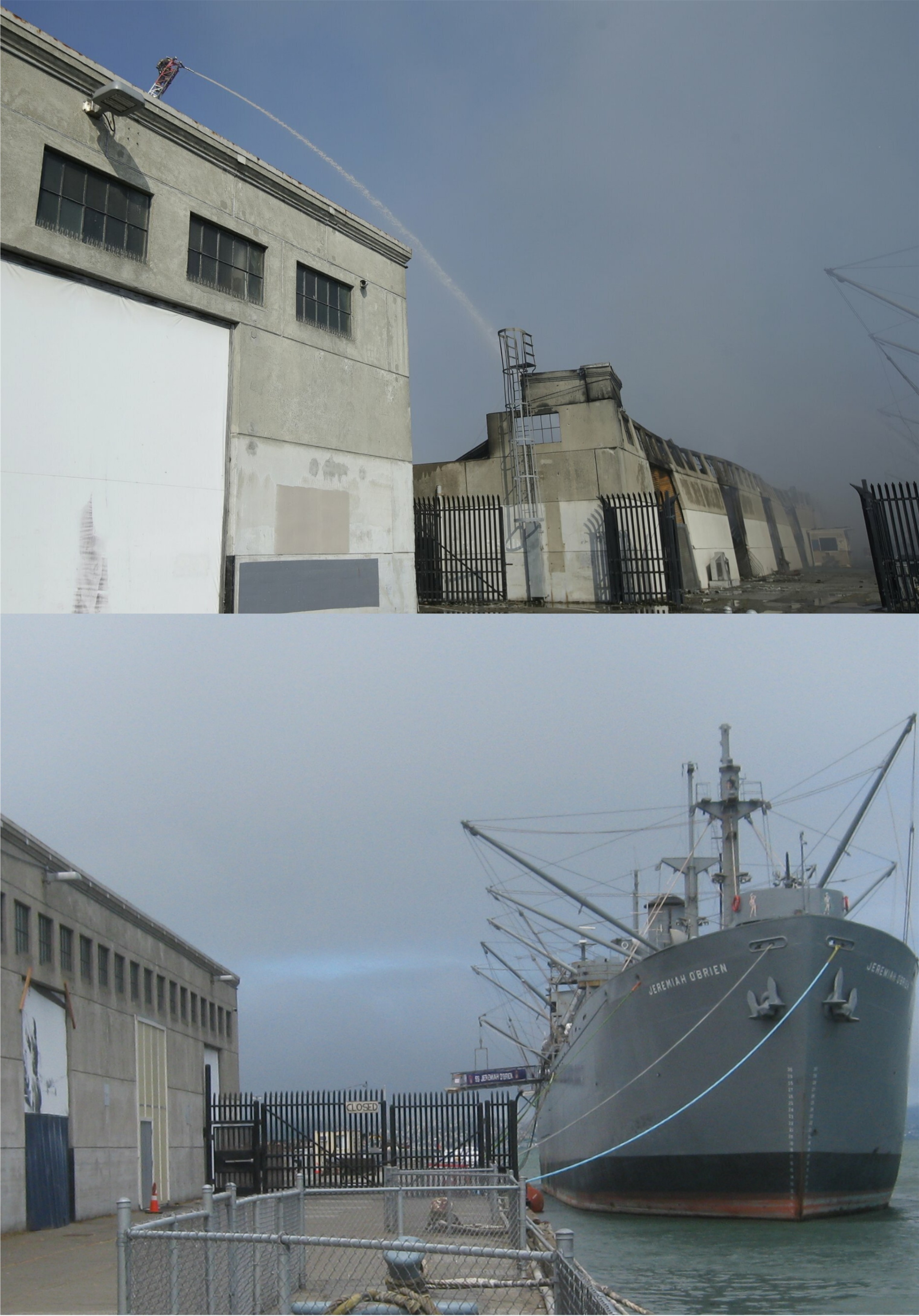 A dramatic aerial photo from WTOP News shows a fireboat, not only trying to put out the fire on Pier 45, but also, desperately trying to save the Jeremiah O’Brien. The aft section of the Liberty Ship is at the top of the photo.