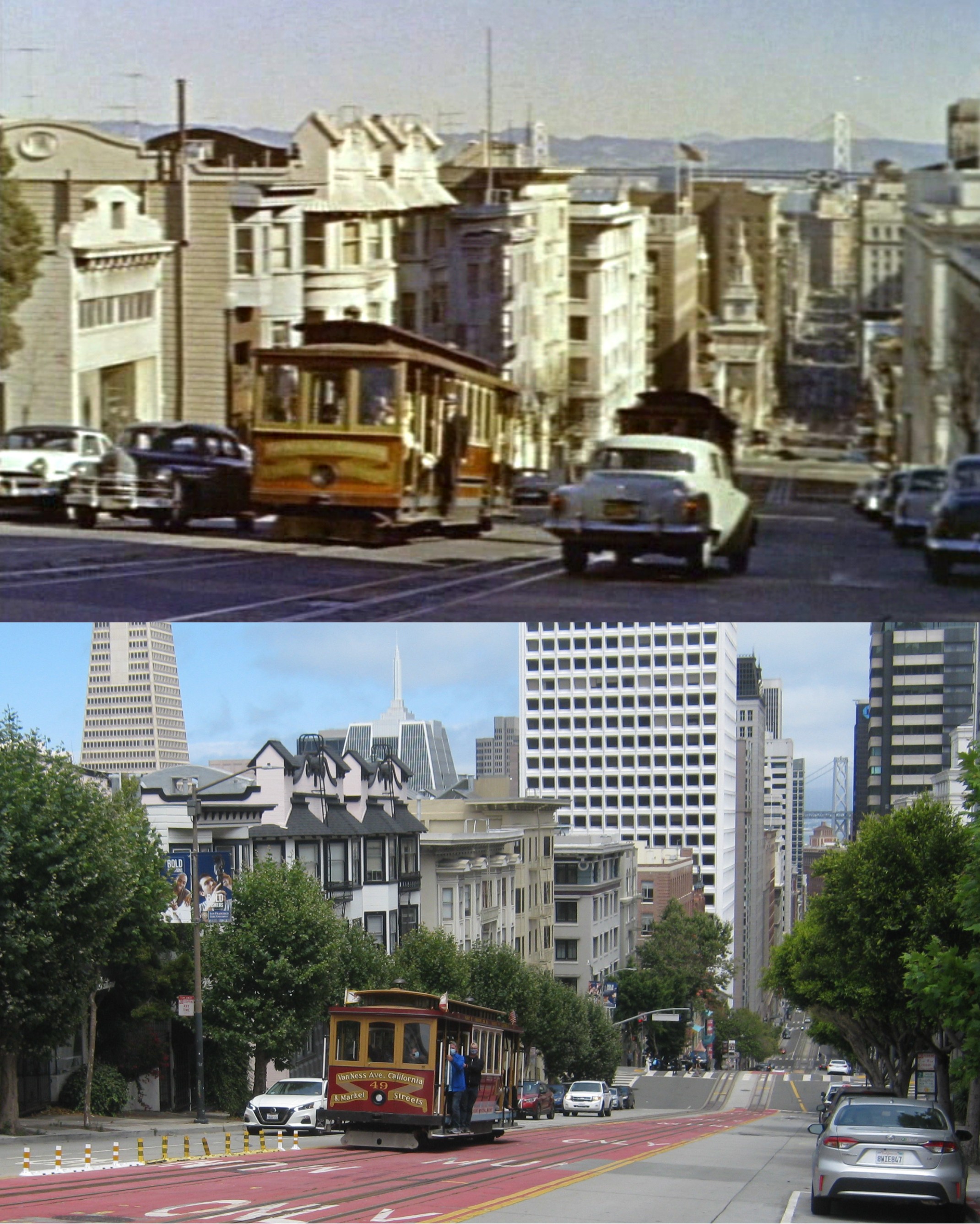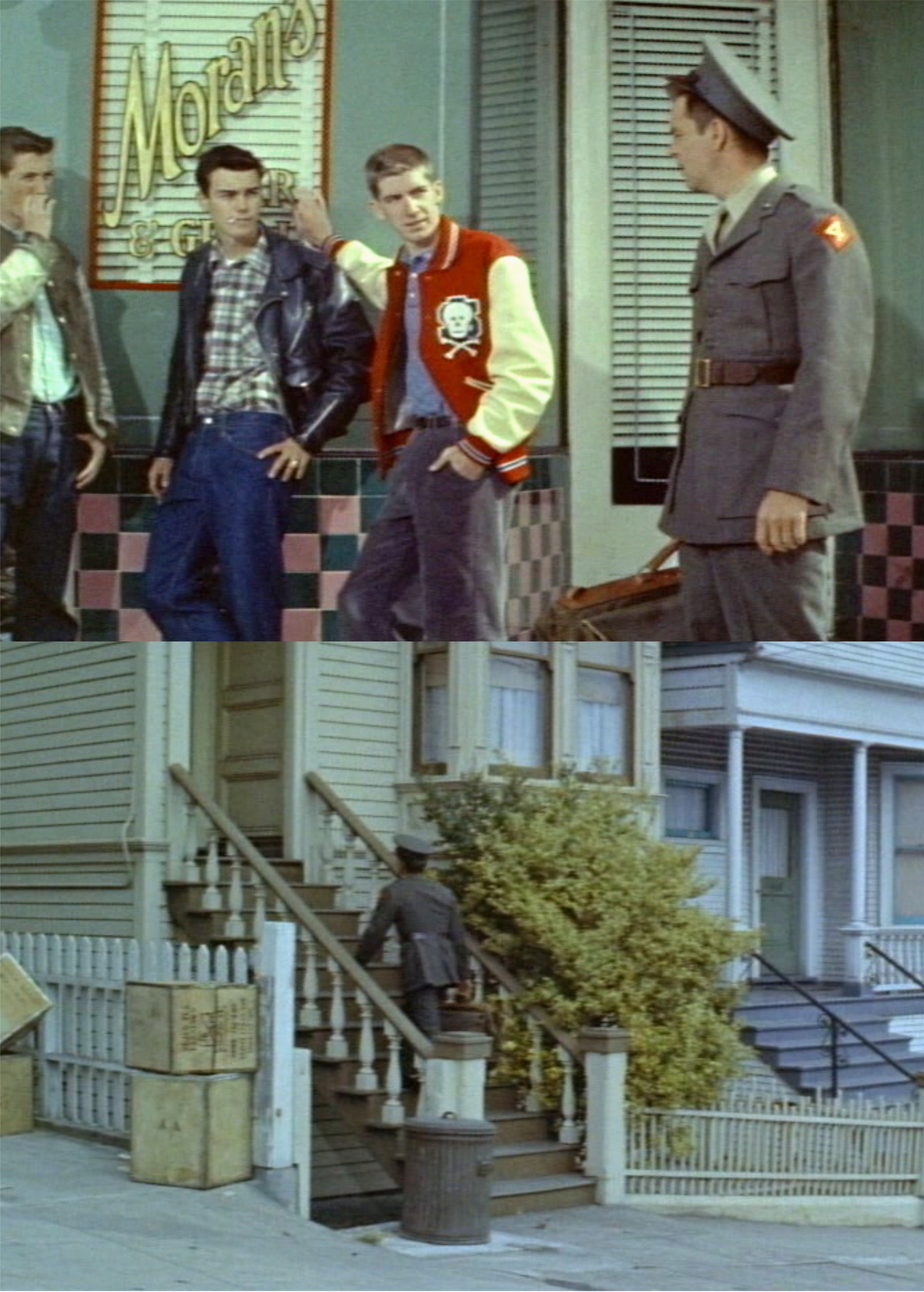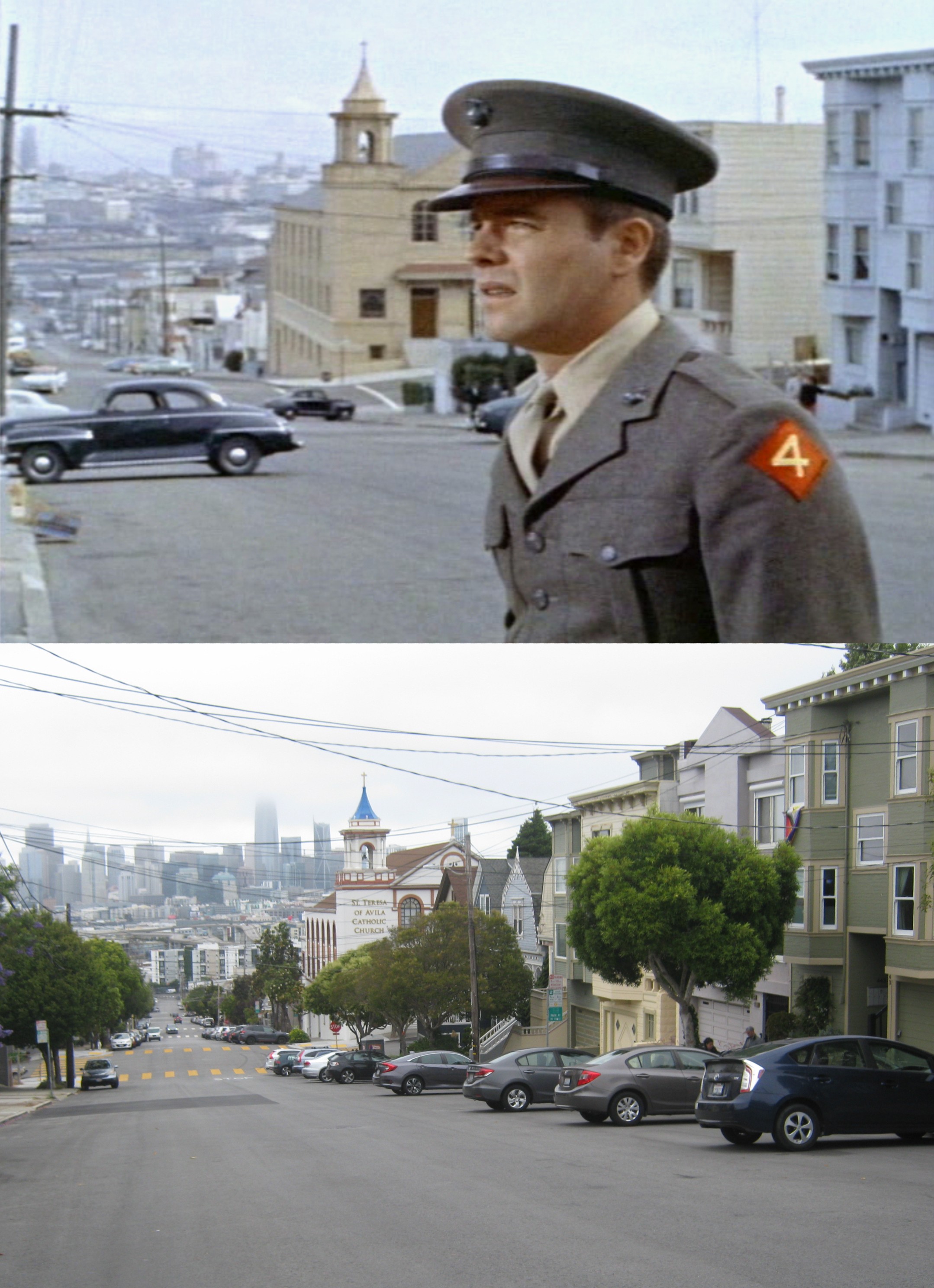 A cable car heads up California Street on Nob Hill at sunrise on the last day of shore leave for the three Marines, and the film includes the obligatory view from the Top of the Mark. Other locations in the movie that I wasn’t able to include are the Hoover Tower in Palo Alto, Monterey and Carmel.