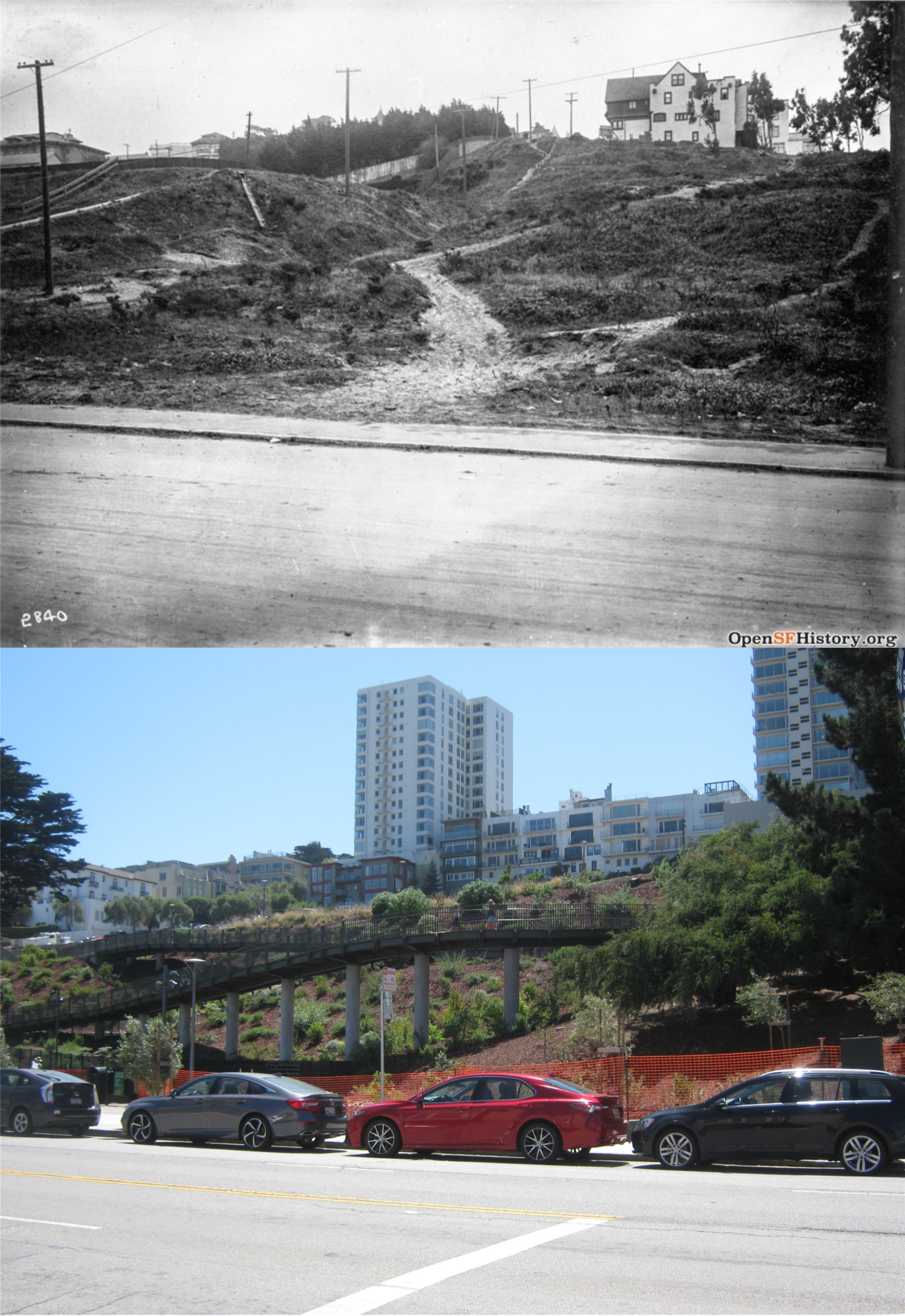 You can see the concrete from the reservoir from Hyde Street on the left in both pictures from an update that I did in March of 2020.