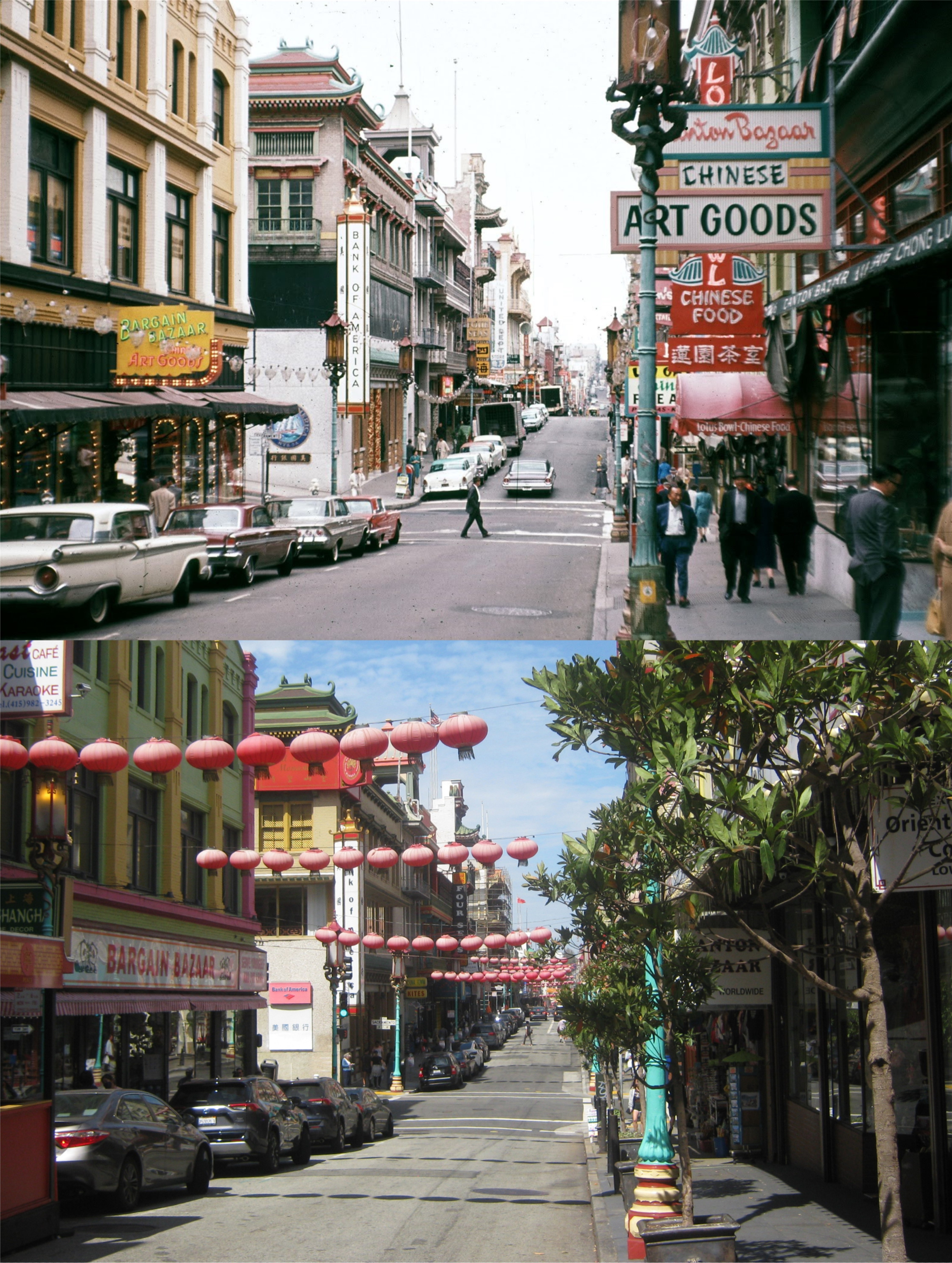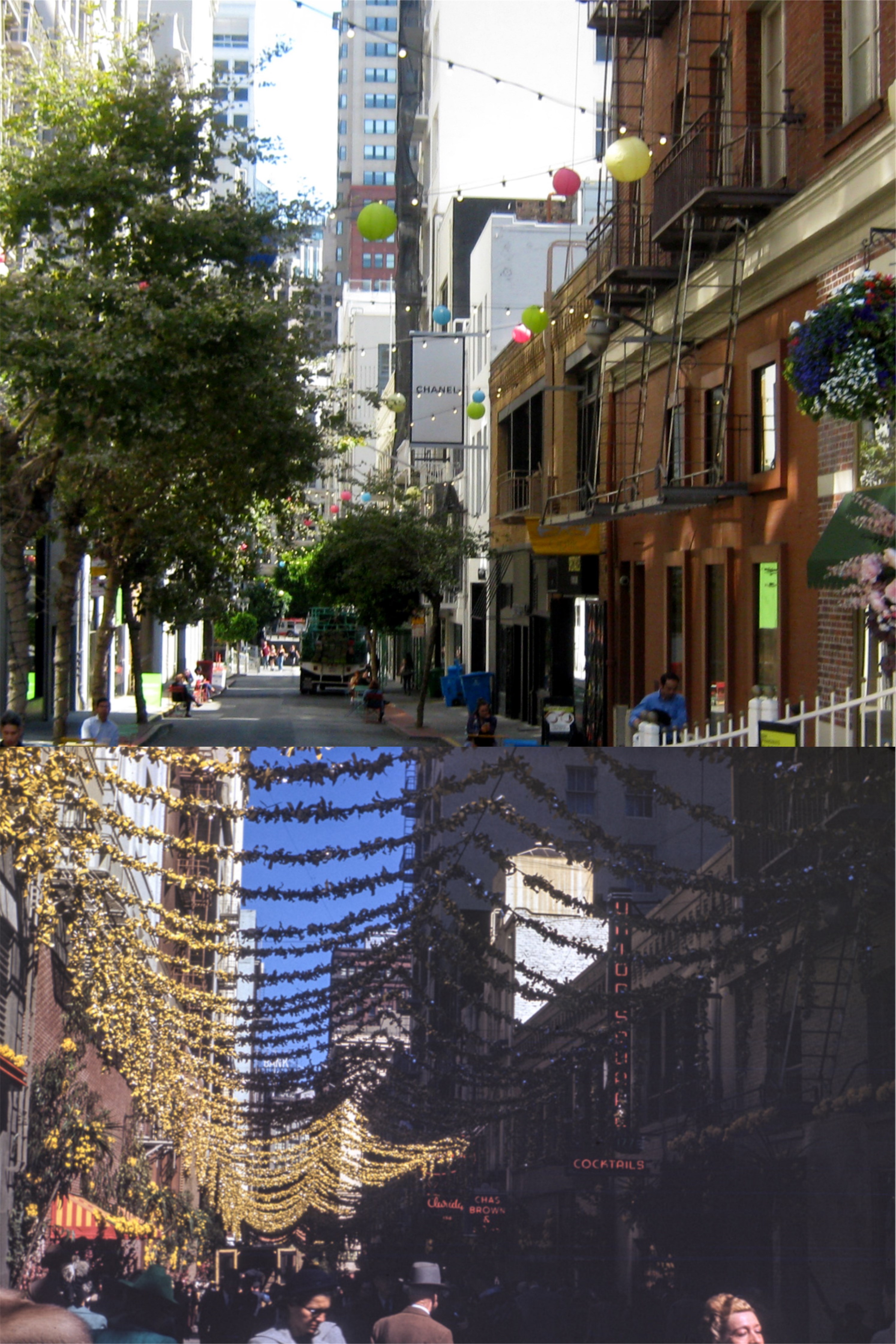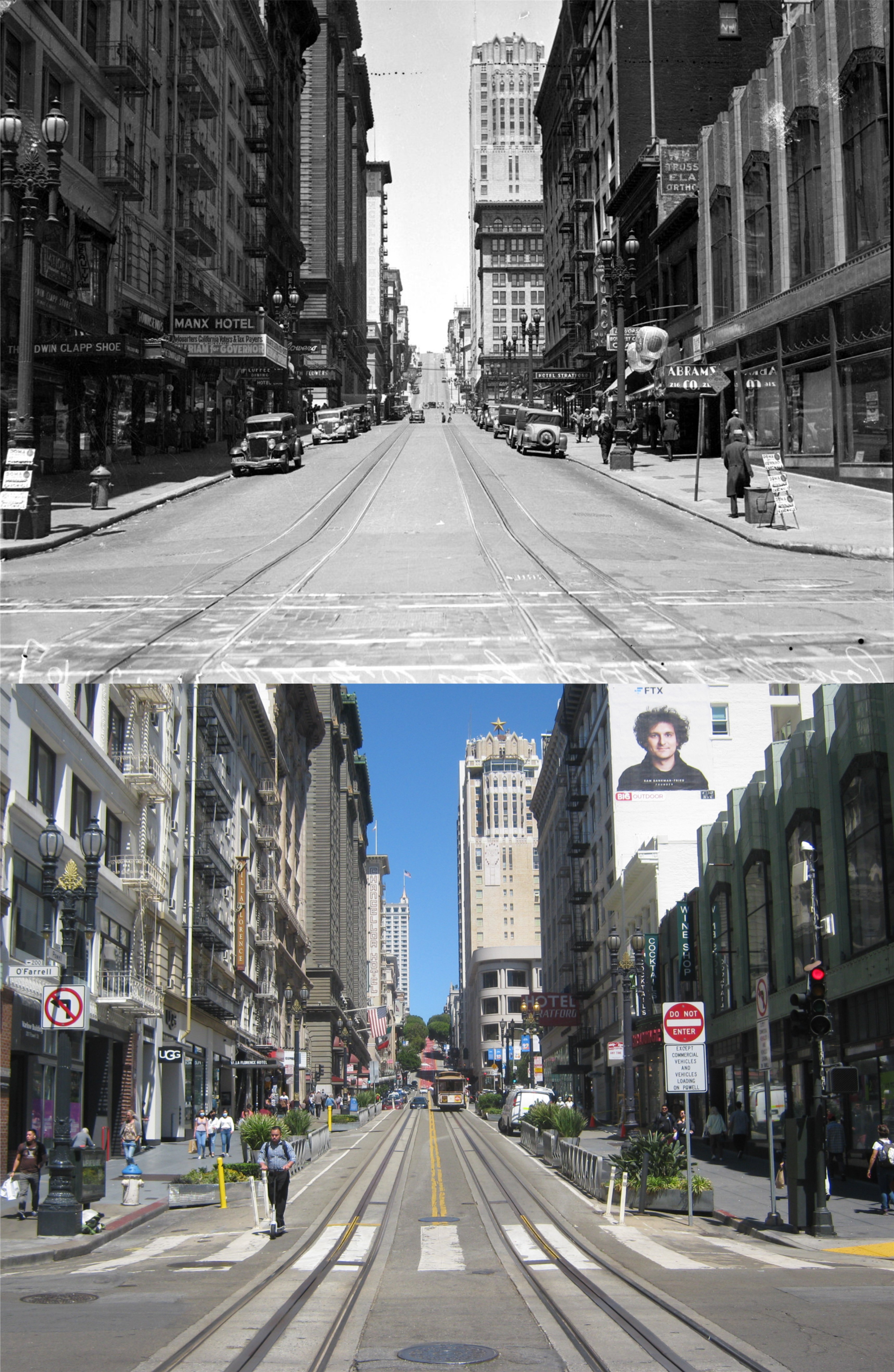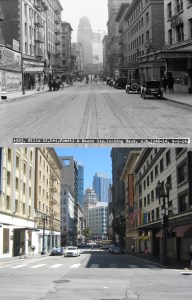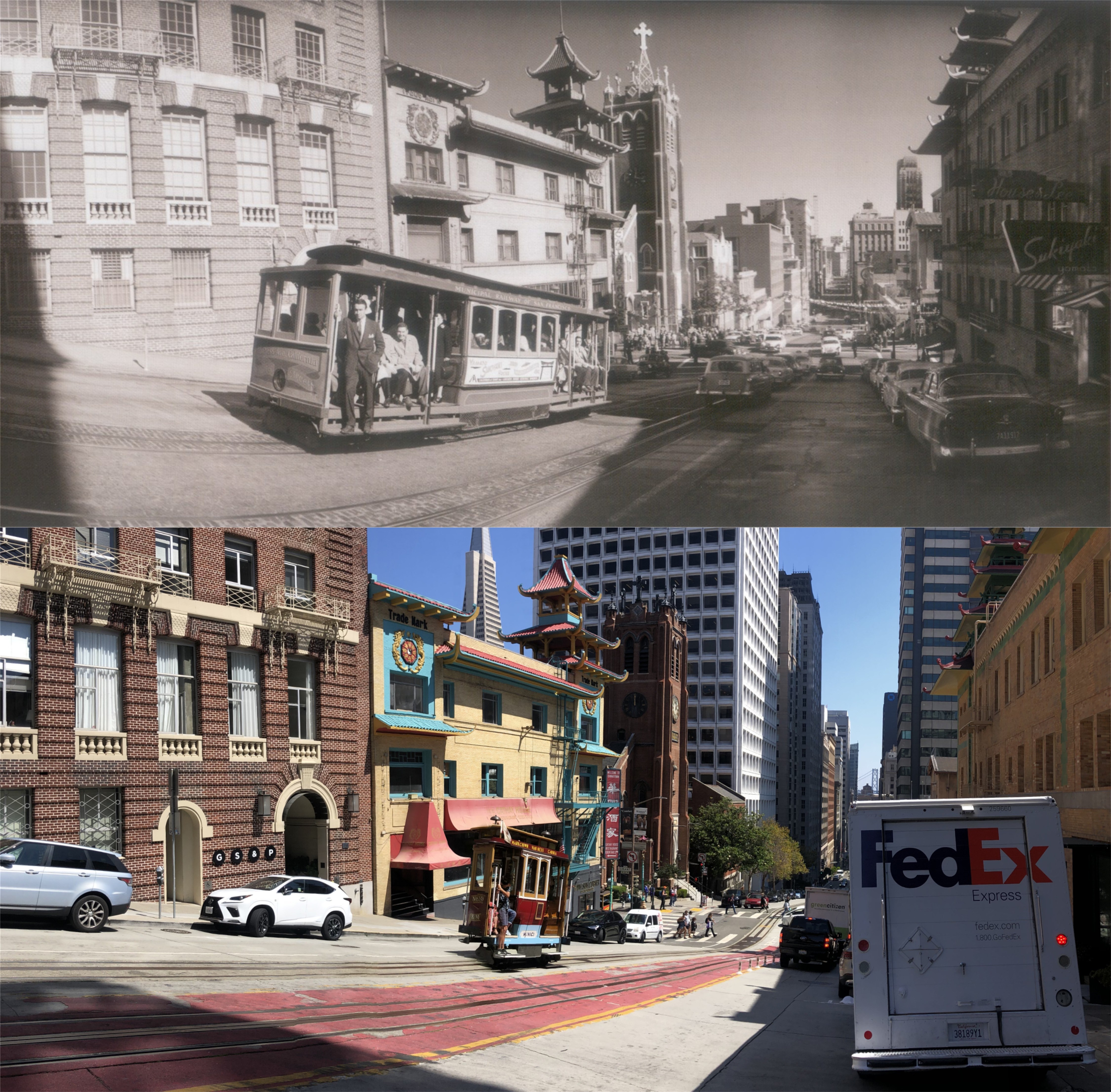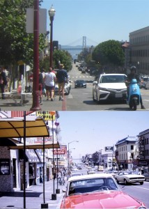 Well, yesterday was the last day of summer. Or is it today? It didn’t seem like much of a summer; I did make it to Disneyland, the Alameda County Fair was back, and I did take a lot of pictures around San Francisco. However, I spent most of my summer evenings at home, drinking beer and watching reruns of ‘Gunsmoke’. Wait a minute, it was a great summer! On the Sunday before Labor Day, I took an F Line streetcar (which was standing room only) to Fisherman’s Wharf, and took the Number 30 Muni Line along Stockton Street back to avoid the crowds. I got a window seat, and took some pictures of cross streets along the way back to Market Street. Later, I tried to find vintage pictures that closely matched the ones I took. Now and thens are a lot more difficult than then and nows for getting comparison pictures and they seldom line up perfectly, but there’s no better site on the internet to find pictures that match-up than opensfhistory.org.