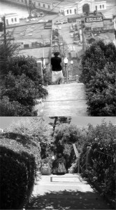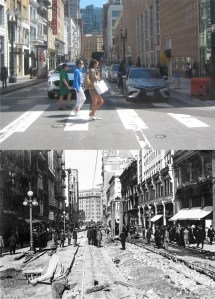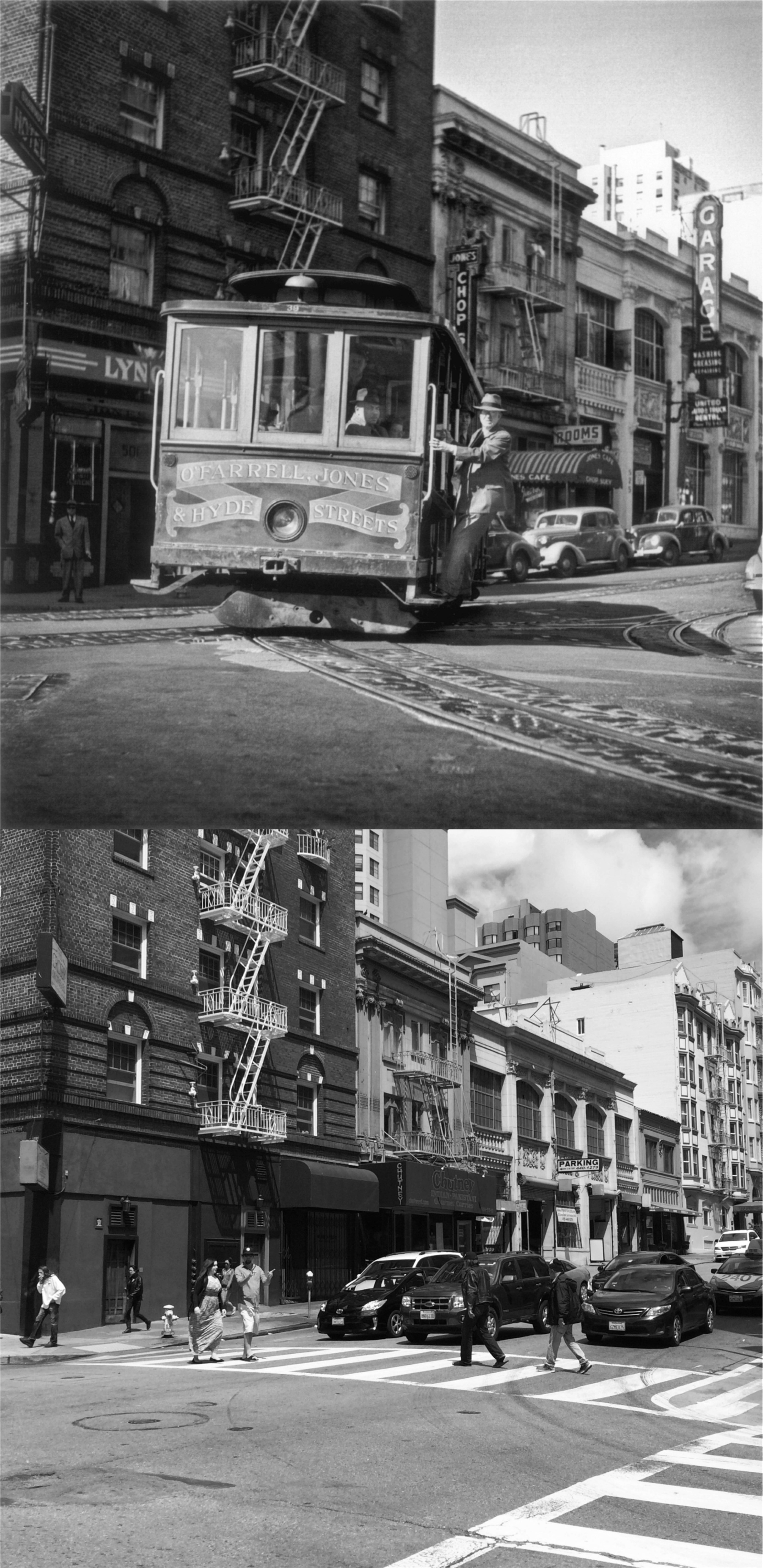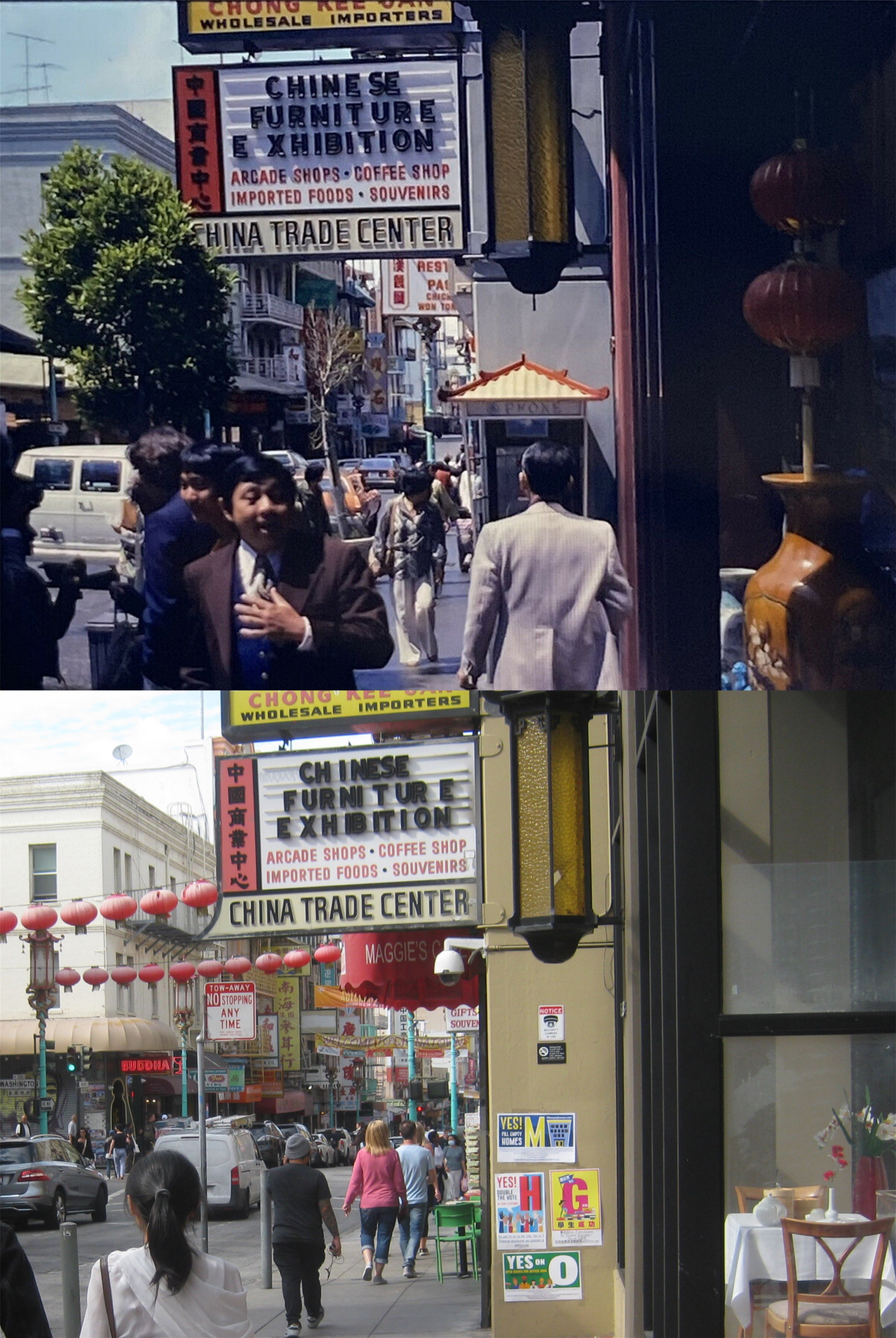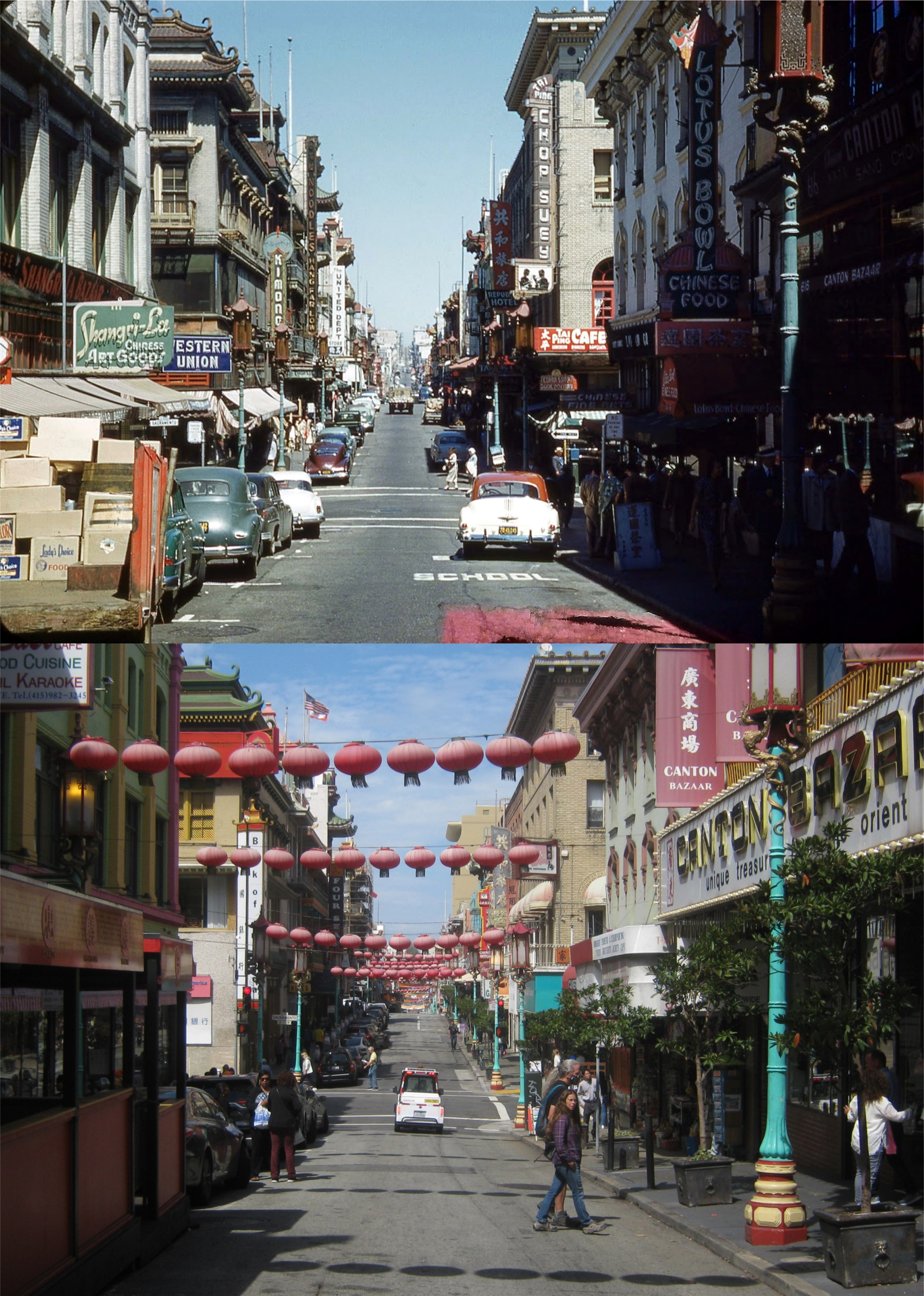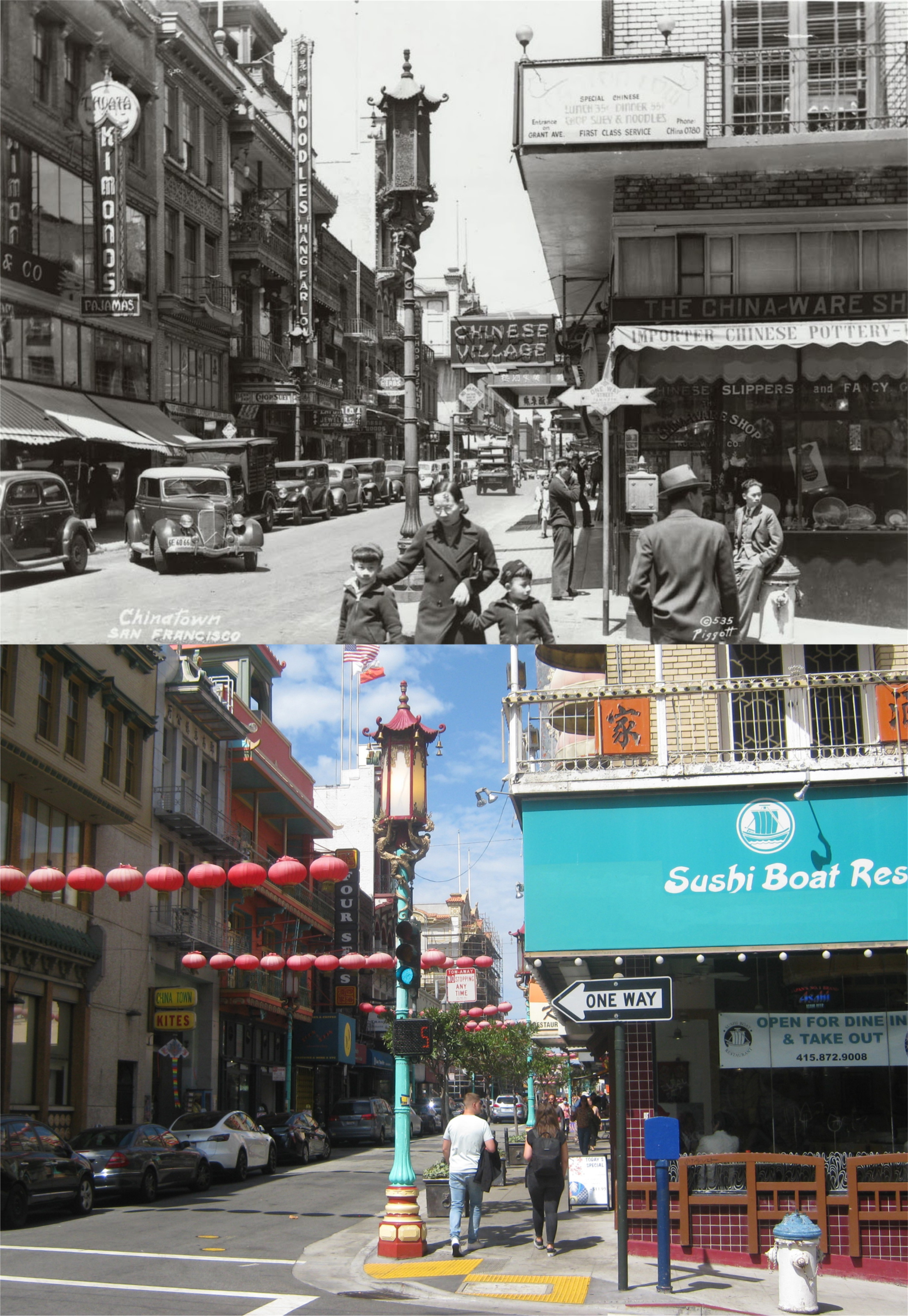 Well, yesterday was the last day of summer. Or is it today? It didn’t seem like much of a summer; I did make it to Disneyland, the Alameda County Fair was back, and I did take a lot of pictures around San Francisco. However, I spent most of my summer evenings at home, drinking beer and watching reruns of ‘Gunsmoke’. Wait a minute, it was a great summer! On the Sunday before Labor Day, I took an F Line streetcar (which was standing room only) to Fisherman’s Wharf, and took the Number 30 Muni Line along Stockton Street back to avoid the crowds. I got a window seat, and took some pictures of cross streets along the way back to Market Street. Later, I tried to find vintage pictures that closely matched the ones I took. Now and thens are a lot more difficult than then and nows for getting comparison pictures and they seldom line up perfectly, but there’s no better site on the internet to find pictures that match-up than opensfhistory.org.