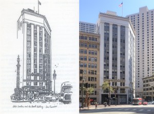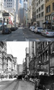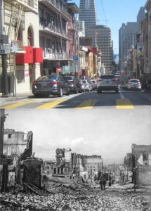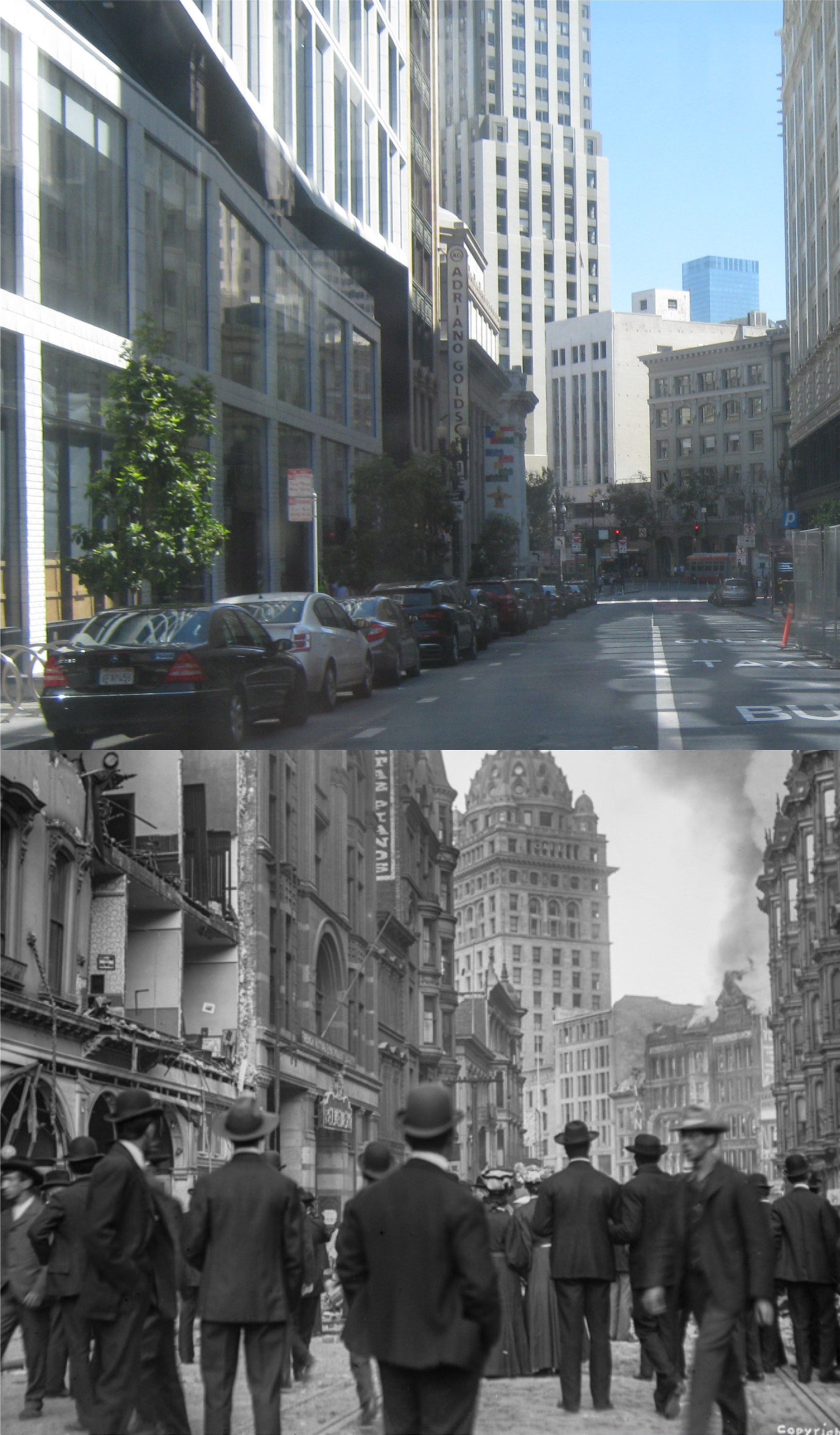 Looking down O’Farrell Street toward Market in 1906; just after the earthquake and before the fire destroyed almost all of this area: The Call Building, now remodeled and called the Central Tower, survived the 1906 disaster and is at right center in both pictures.