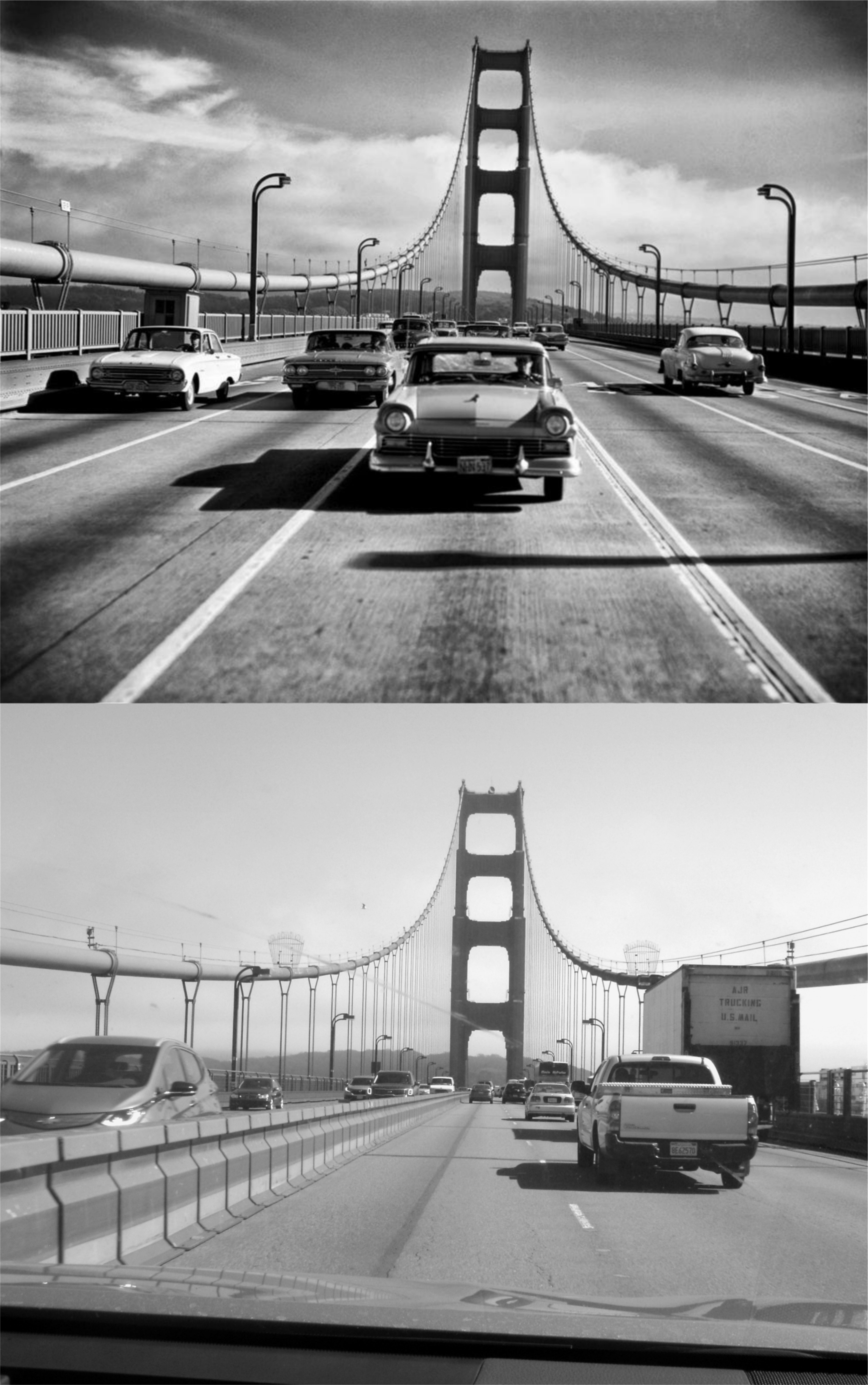 Broadway at Stockton Street in 1969: I was relatively close to where the older picture was taken, although a little further back, but I got a closer image of the Bay Bridge.