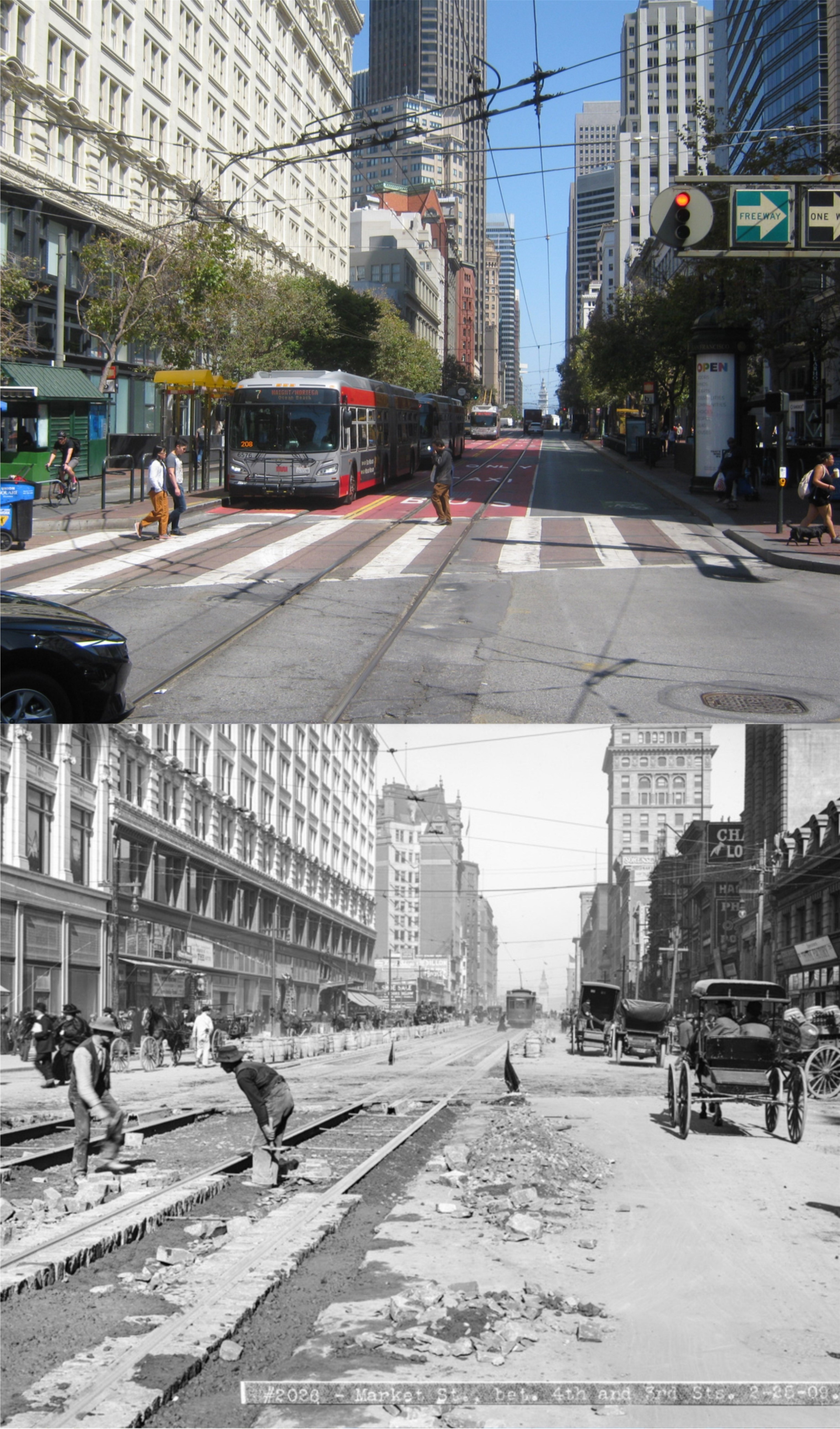 Here, the #30 crosses Market Street from Stockton to 4th Street, and is where I got off the bus. The vintage picture from 1909 lines up pretty good with the shot I took through the bus window, and a lot of the buildings seen in the old photo, such as the Phelan Building, the Gothic Mutual Savings Bank Building, and the Call Building can still be seen.