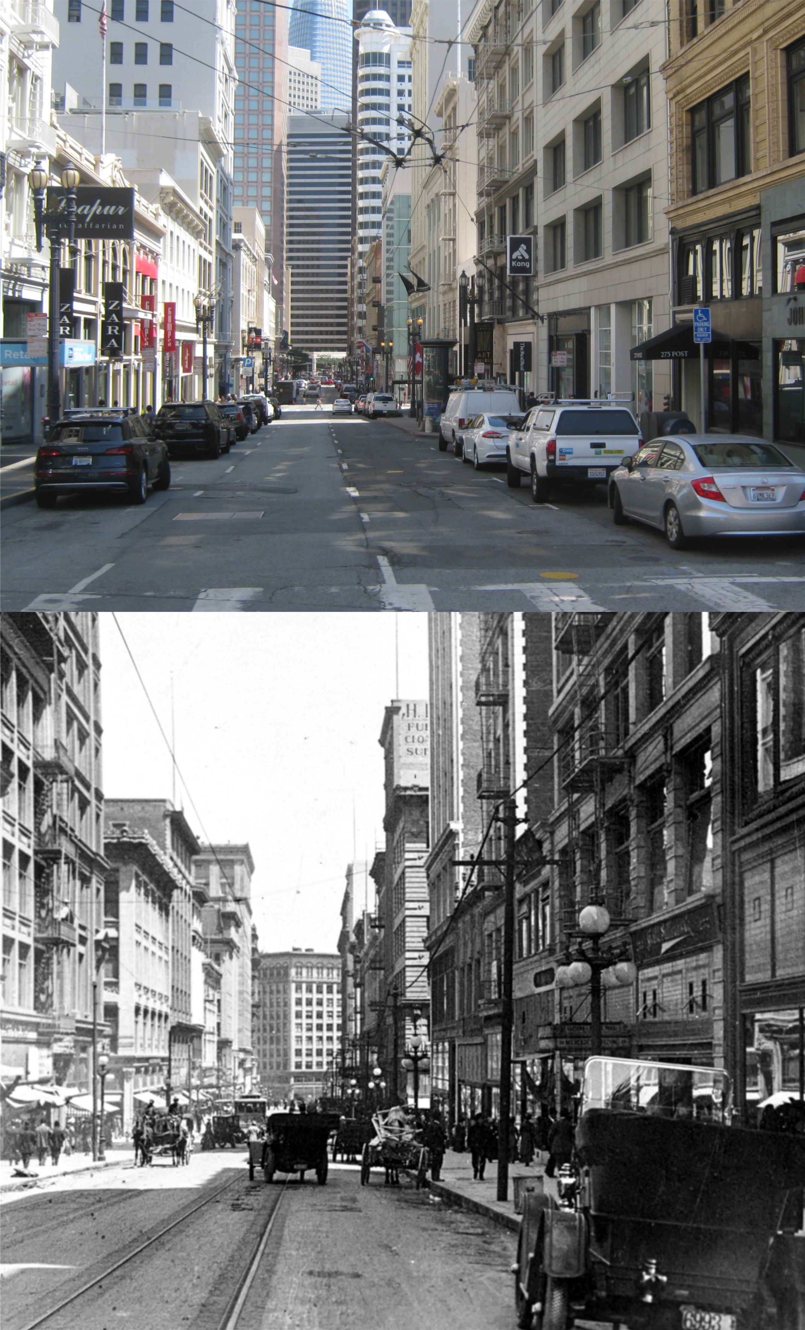 Looking down Geary from Stockton Street toward Market Street in 1912: You can see the Palace Hotel in the far background in both pictures.