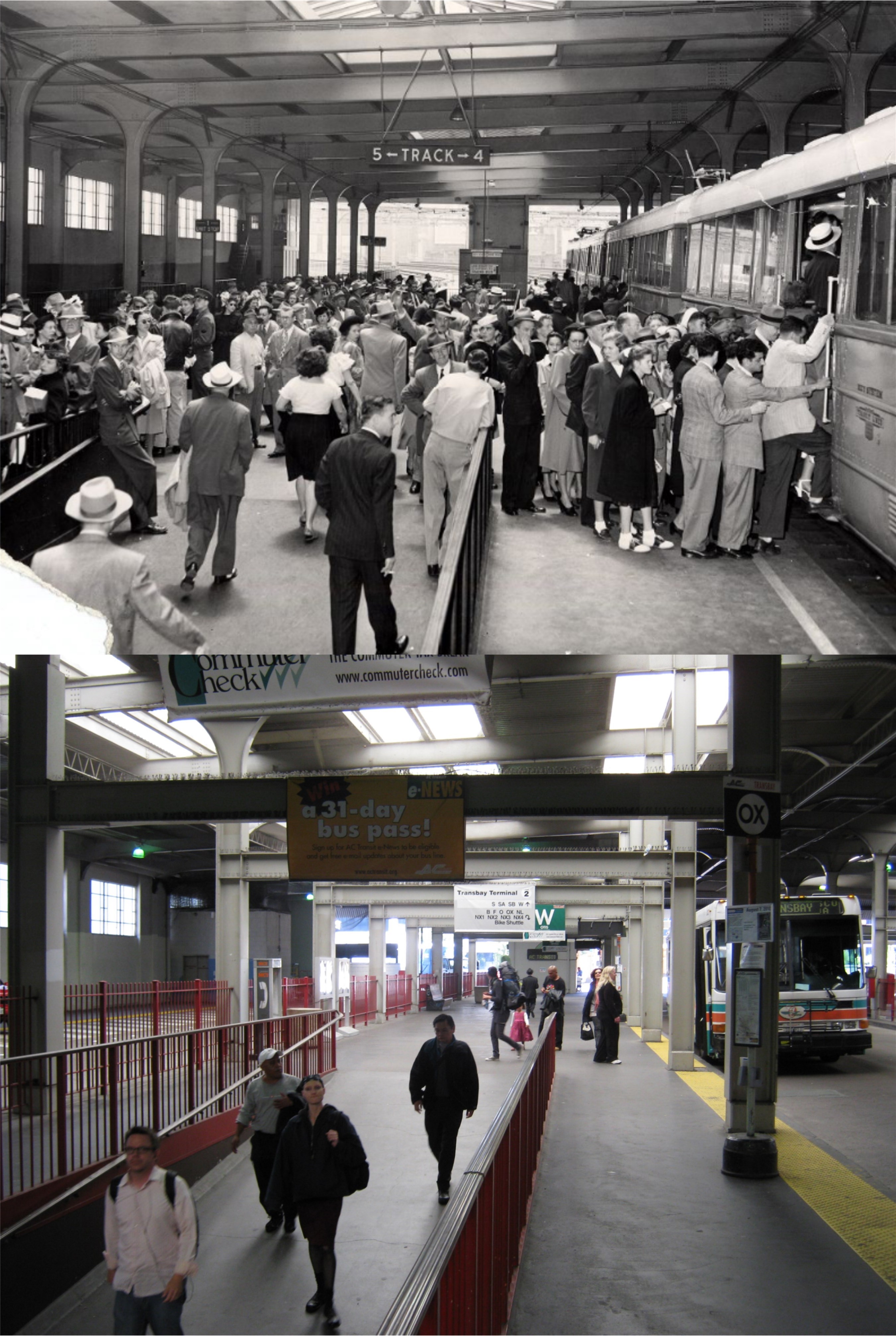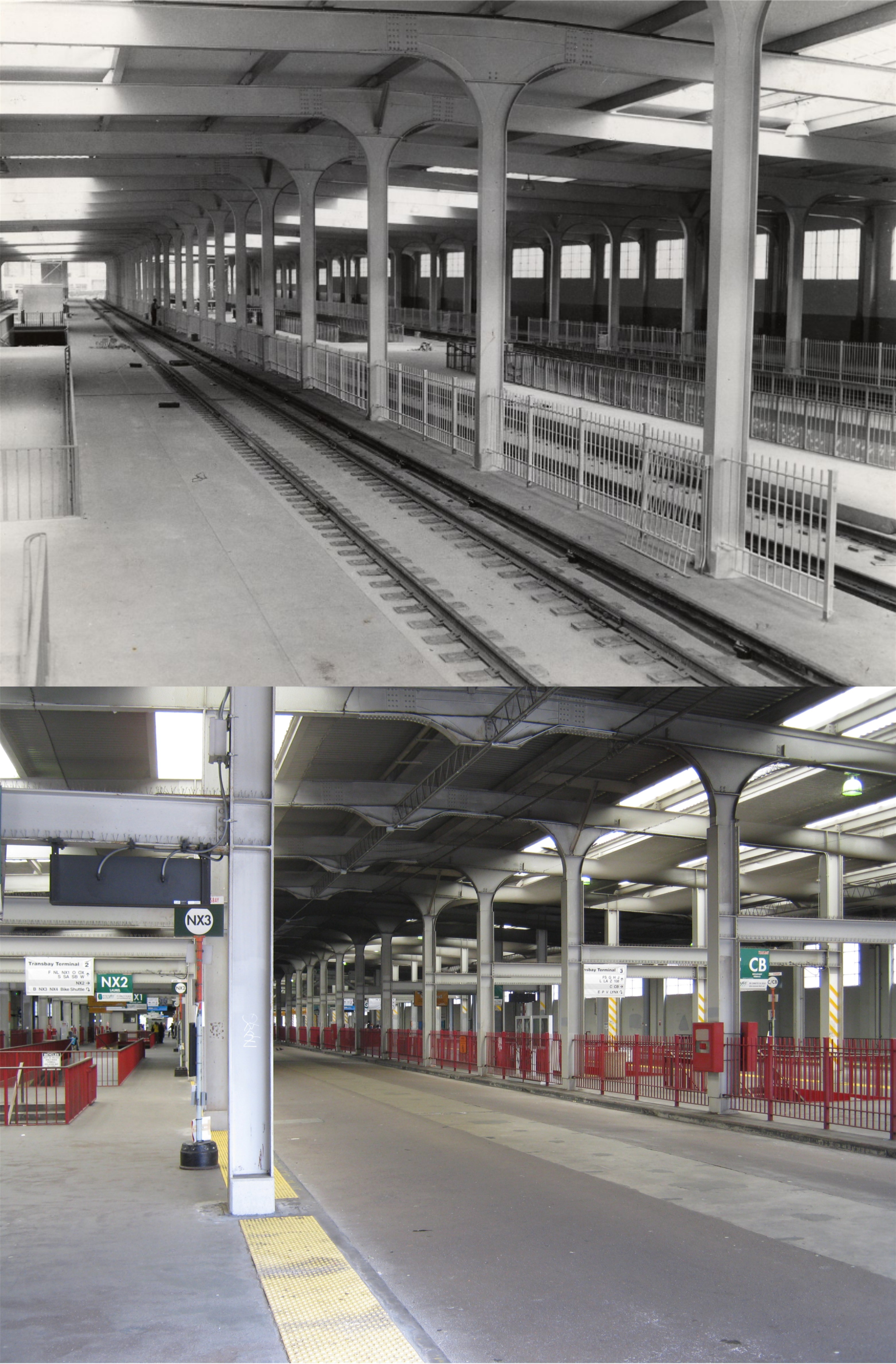 Looking toward Fisherman’s Wharf and Pier 45, with the Van Ness Pier on the left. The ship docked at Pier 45 in the 1983 pictures isn’t the Liberty Ship, the Jeremiah O’Brien, docked there today. On the right, you can see the arch of Pier 43 in both pictures. The sailing ship, the Balclutha, was still docked at Pier 43 in 1983.