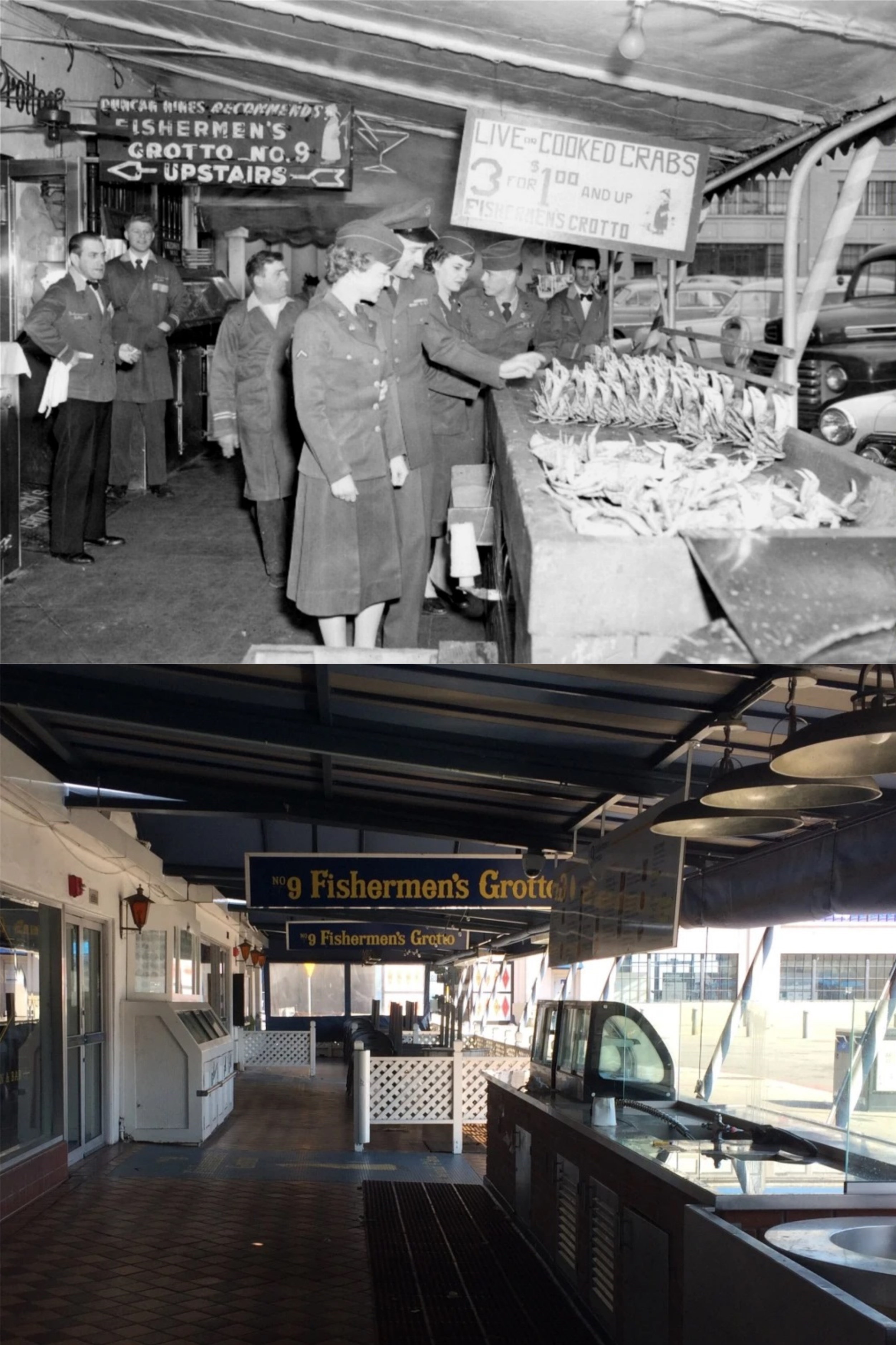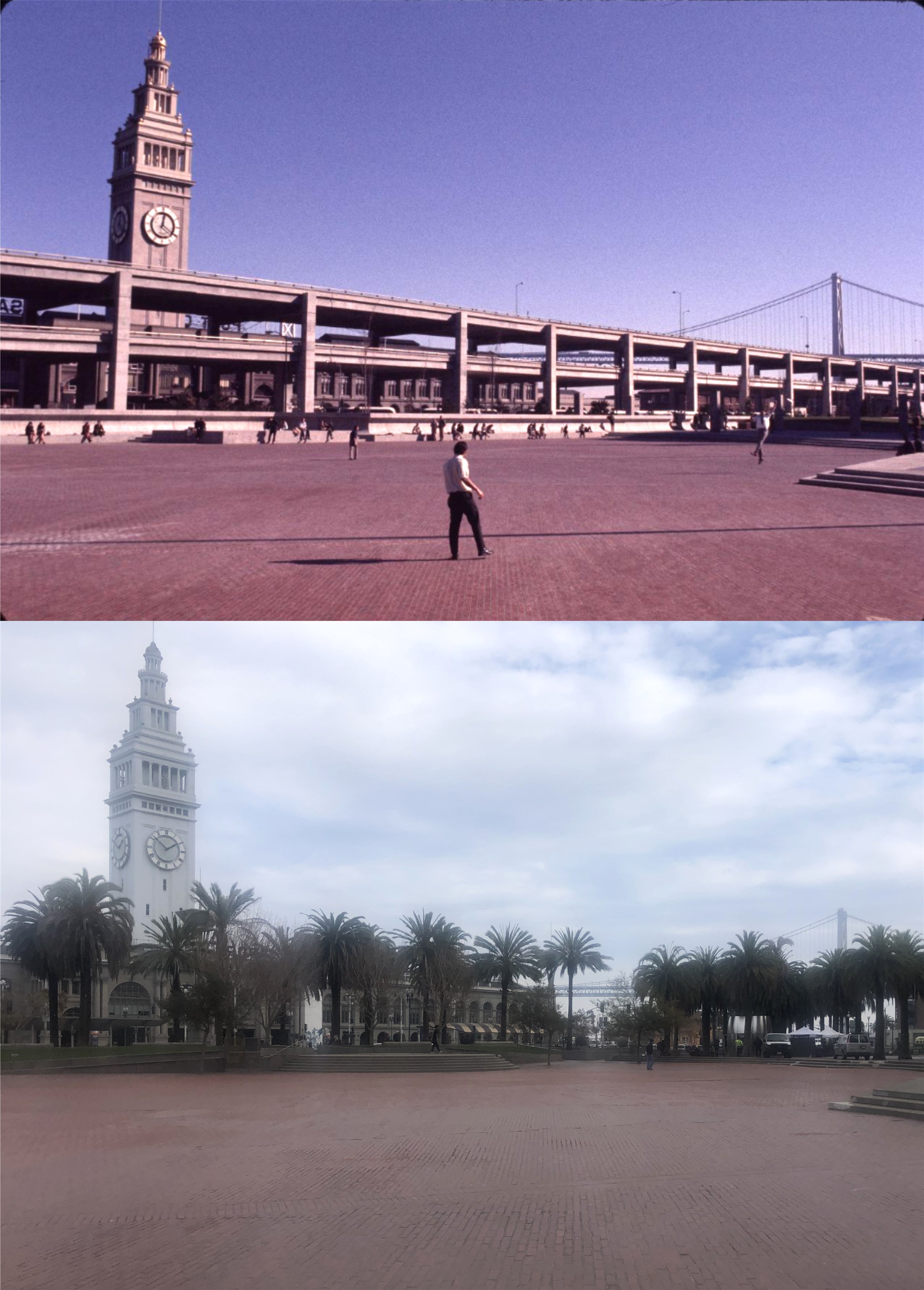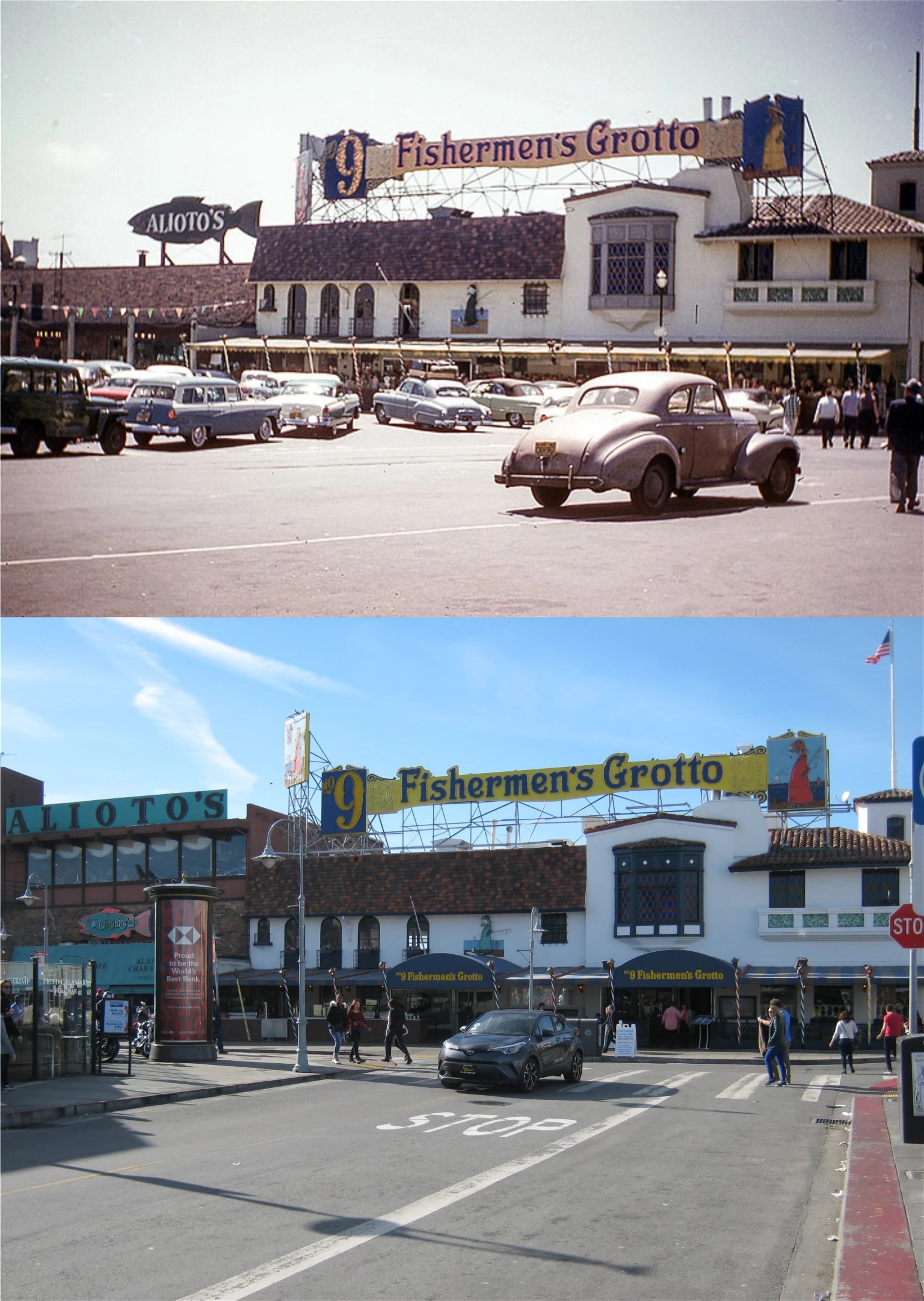 I first learned about the book ‘San Francisco, Portrait of a City’ by Taschen Publishers last spring. It looked promising, but at $75.00, it seemed a little pricey, so I thought I’d wait awhile to see if I could buy a cheaper copy later. The price didn’t come down much by year’s end, but I did find a copy for sale at $55.00 in December on the internet. Here’s the first thing I’ll say about the book; it’s probably the heaviest book I’ve ever tried to read. At nearly ten pounds, if you were to drop it on your foot, you could possibly become crippled for life. The reason for this is that for each chapter, the text is printed in English, German, and French, separately. This makes the already oversized book weight three times as much as it normally would. The pictures aren’t repeated though, so for each chapter, the picture descriptions in the book appear in all three languages. That being said, if you can find a good desk or drafting table to prop it up to, the book is well worth browsing through. Mainly, this is because of the terrific vintage pictures throughout the book; some of which I’ve cover in the past from different sources, but many that I’ve never seen before. The cover picture here is at the Grant Avenue at Bush Street entrance to Chinatown during the 1950s. My update on the right is from June, 2022. (Thumbnail images)