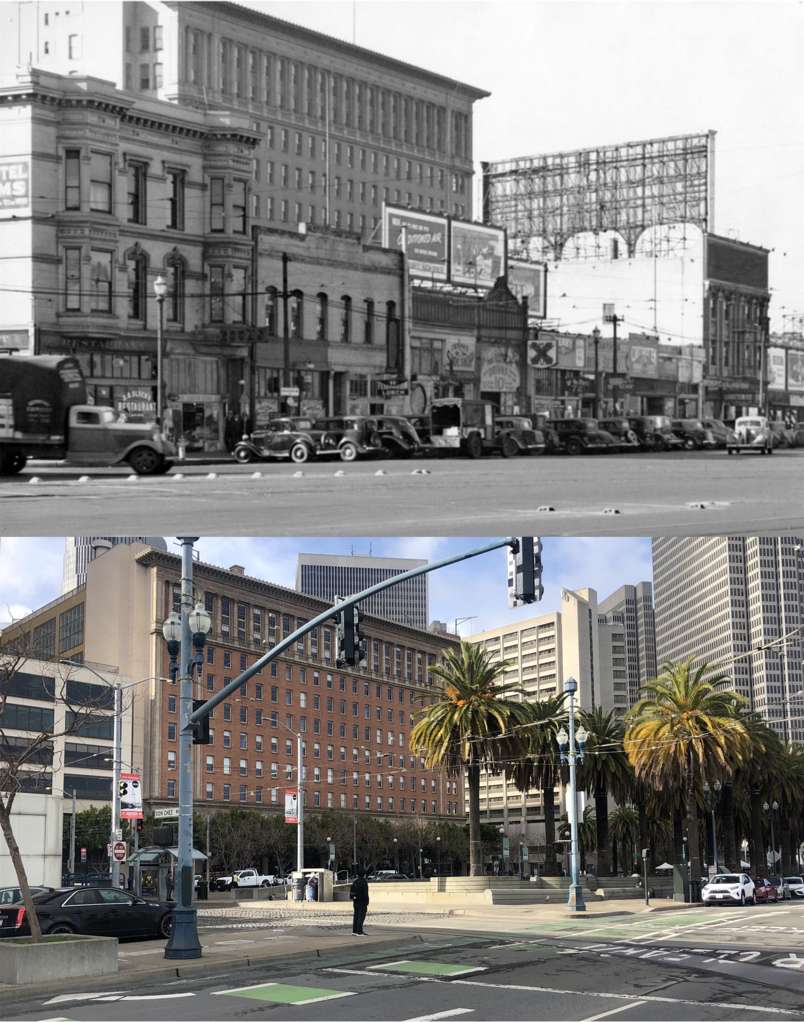 The Chinese New Year Parade, coming up Pine Street near Grant Avenue in 1934, was a much smaller event back then. At the end of Pine Street, at Market Street, you can see the Matson and PG&E Building in both pictures. The enormous Russ Building, once the tallest building in San Francisco, can be seen peeking out on the right in my photo. The little white building with the uneven windows in the foreground on the right is still around.