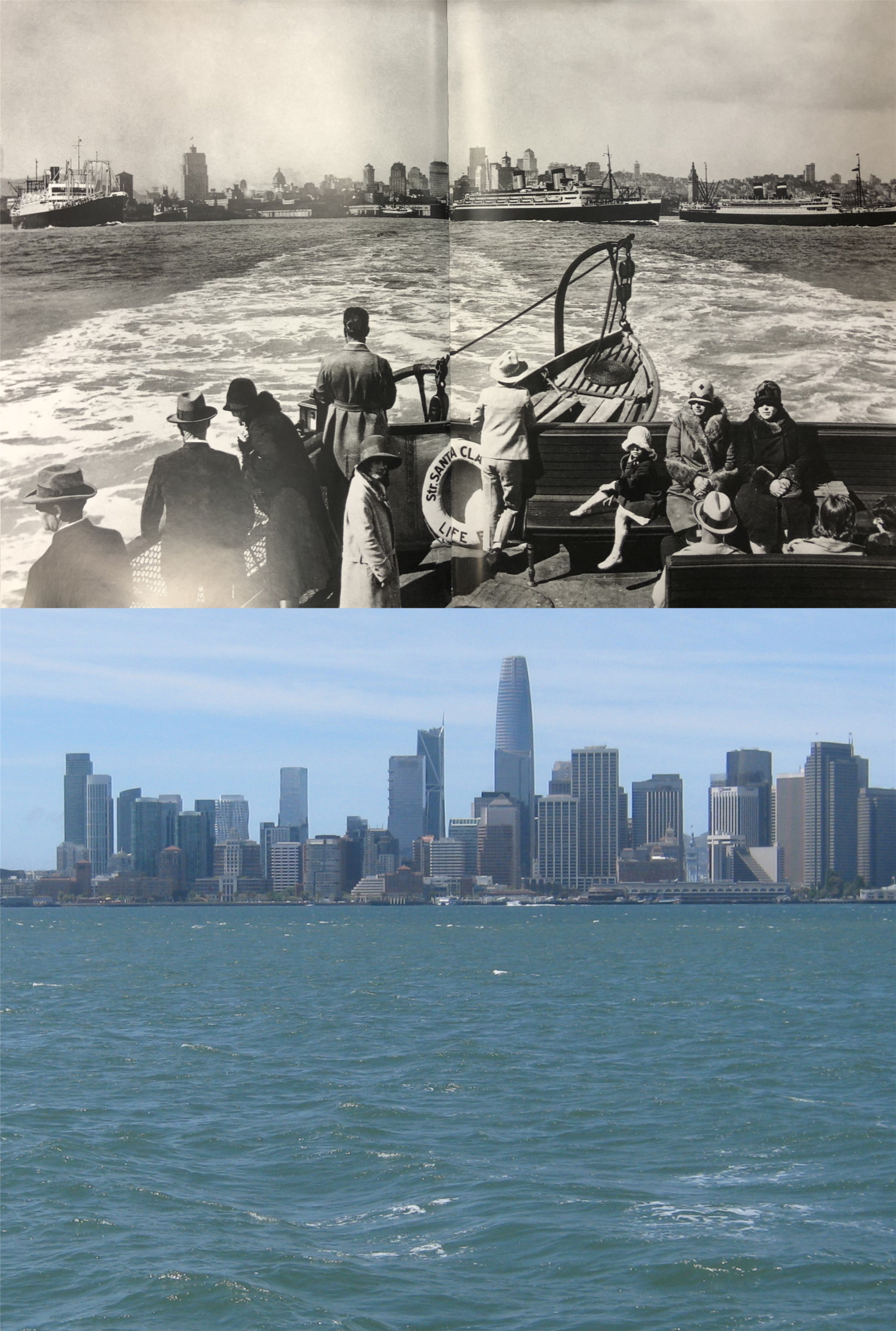 A two page image of the San Francisco skyline from a ferryboat during the 1920s: My update isn’t a bad attempt, as far as bad attempts go, considering my picture was taken several nautical miles north of the path the ferryboat in the vintage image was taking. Some of the buildings still around, that you can see from left to right in the vintage picture, are the Hills Brothers Building, the Pacific Telephone Building, the Call Building, the Hobart Building, the Hunter-Doolin Building, the Matson Building, the Russ Building, the Mark Hopkins, and the Ferry Building.